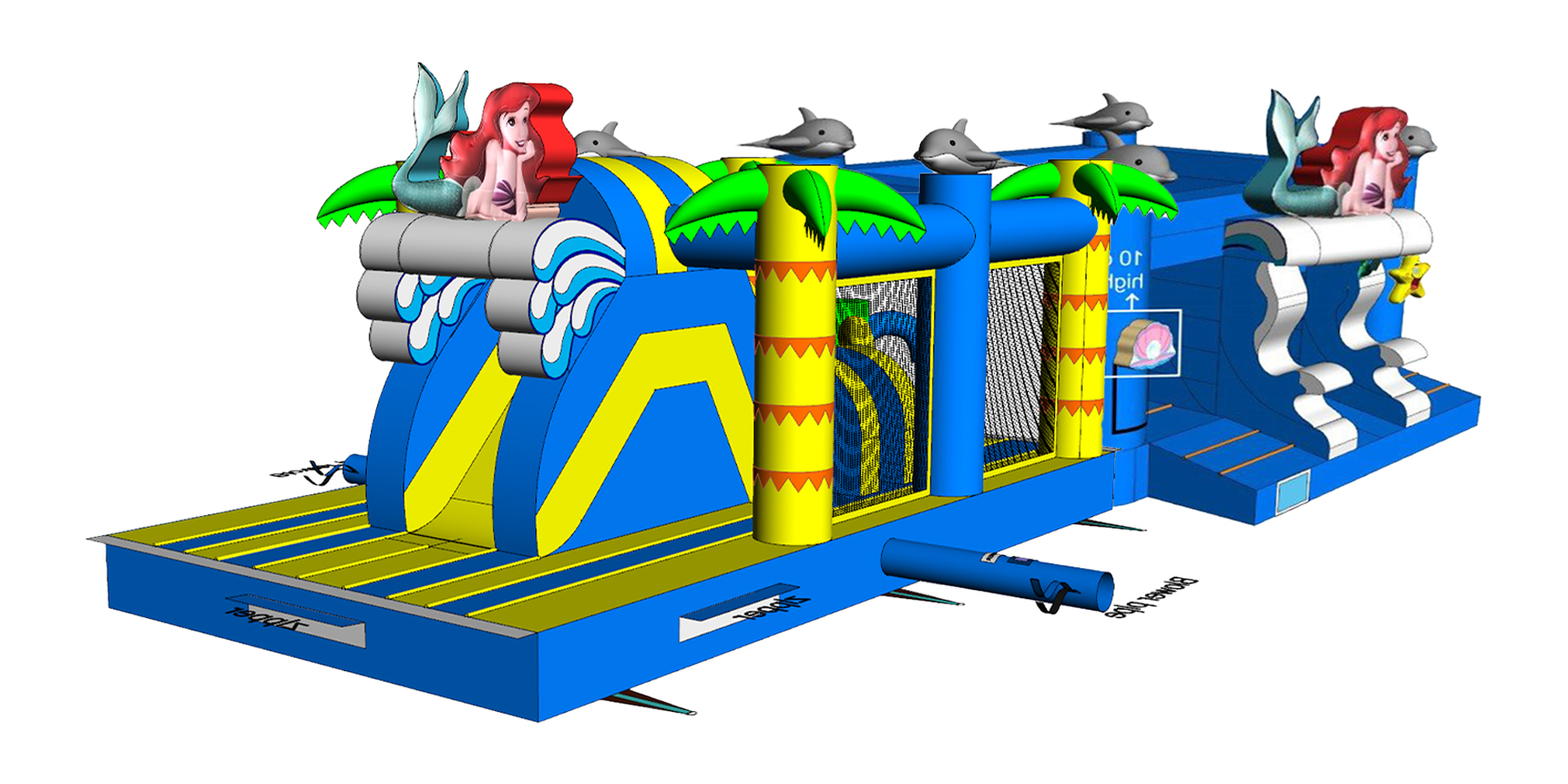 Onze hindernissenbaan van 11 meter bestaat uit 2 delen die qua uitzicht en beleving 1 groot springkasteel vormen. Het zijn eigenlijk 2 springkastelen die in het midden met een velcro aan elkaar worden gekleefd (professioneel en heel stevig) tot een hindernissenbaan uit 1 geheel.