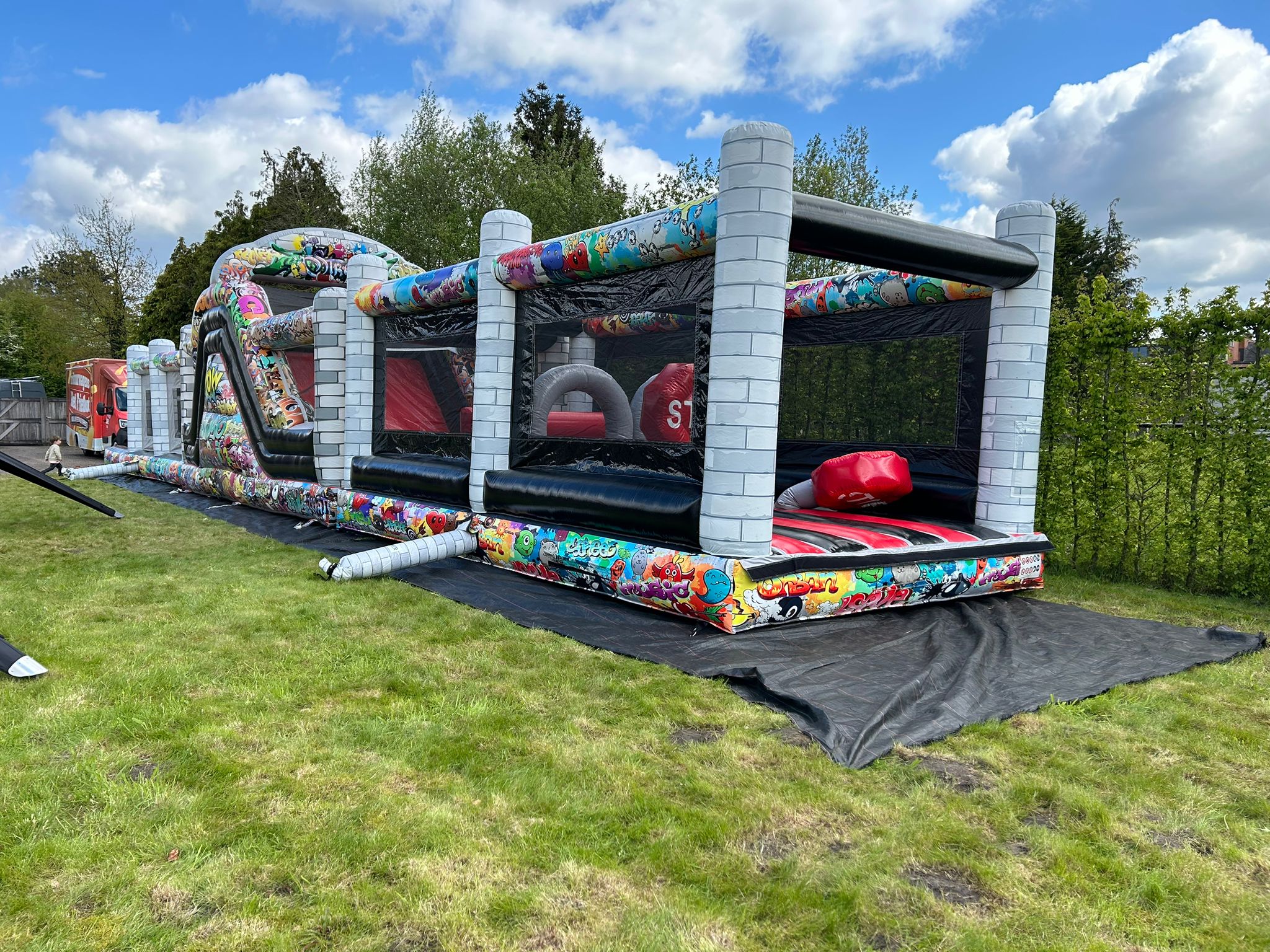 Onze hindernissenbaan van 21 meter is een reuzegroot springkasteel met plezier voor jong en oud.