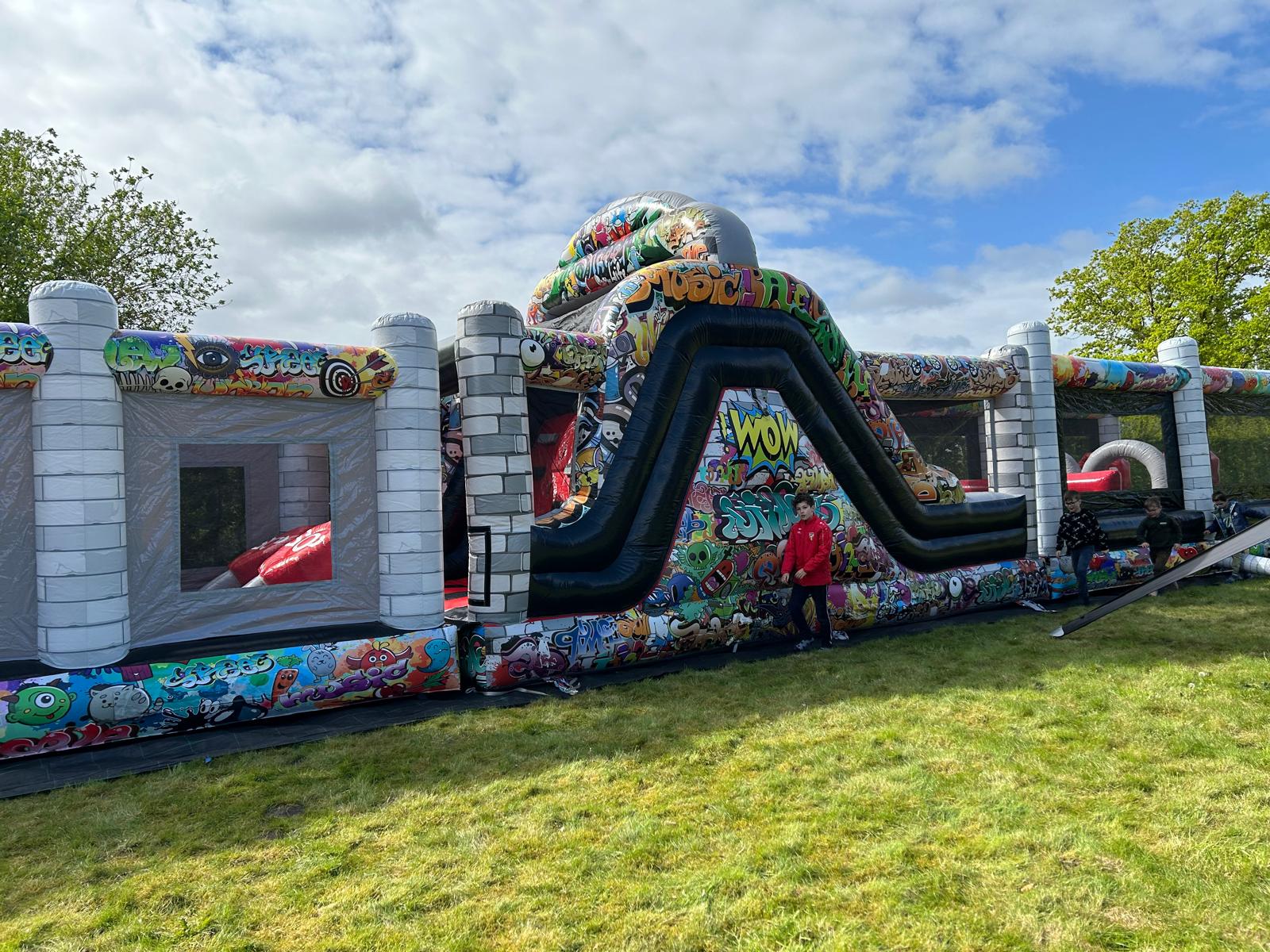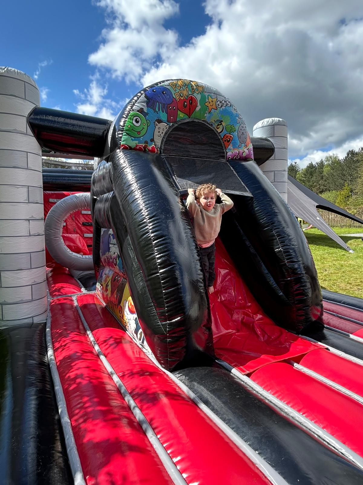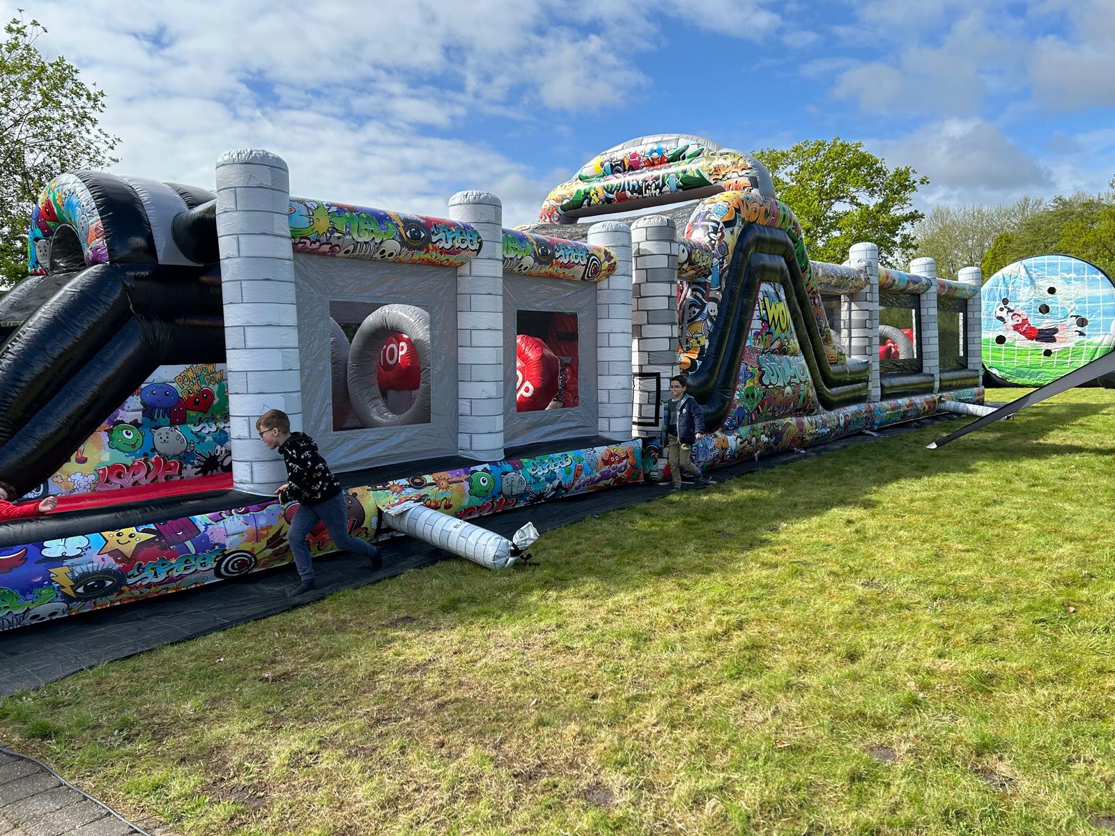 Met aan de ene kant een grote glijbaan van 7meter lengte en de andere kant 14 meter lang aan obstakels en springoppervlak is het Fun met de grote F.