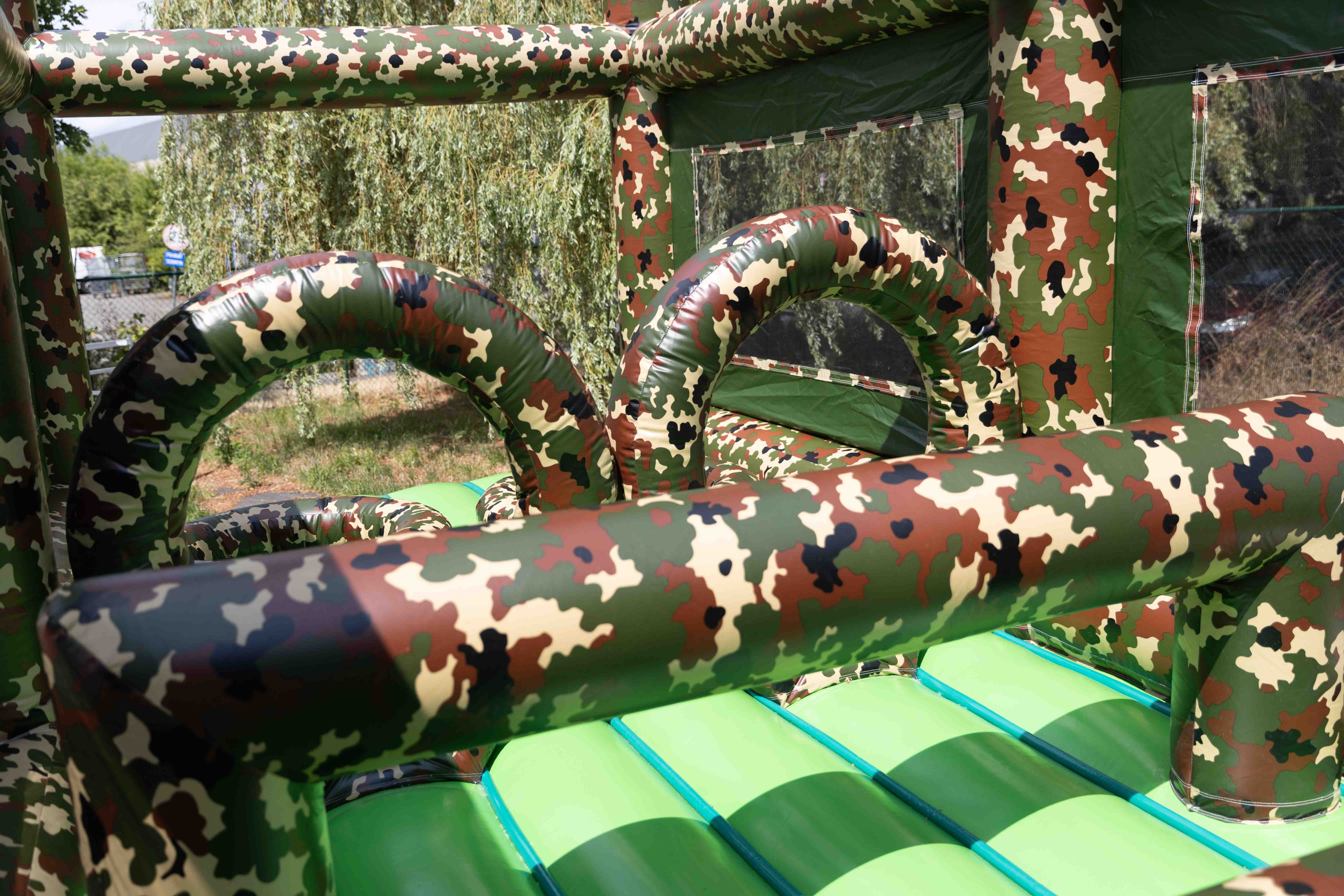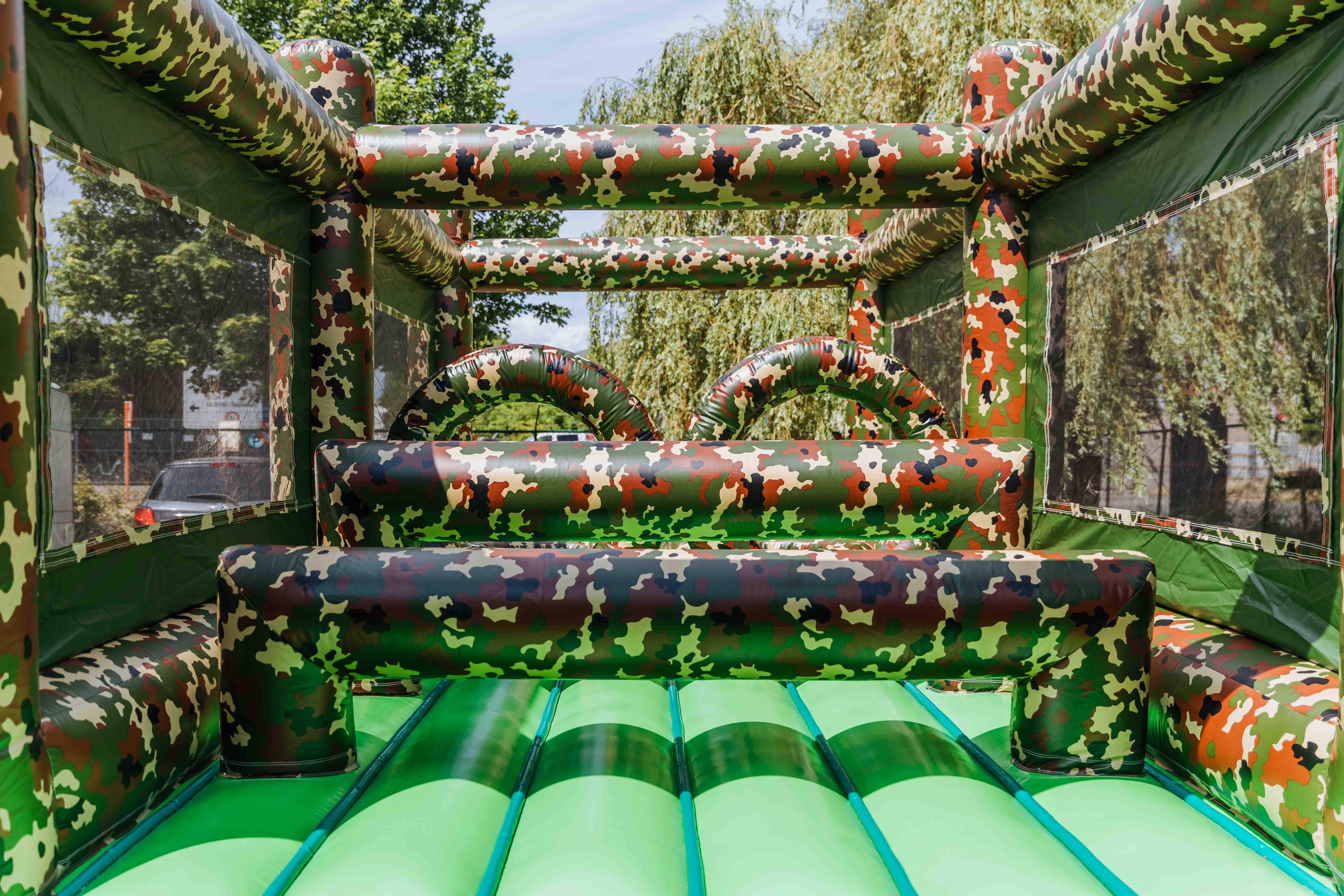 In ware camouflagestijl zoals het hoort is onze aanbod aan legerspringkastelen opgebouwd. Het leger is voor vele kleine jongens en ook meisjes een droom. Zij zullen dan ook fan zijn van dit knap uitgewerkt thema. Als een echte soldaat spring en tuimel je door de hindernissen en kijken we vol bewondering naar de tank of vliegtuig!