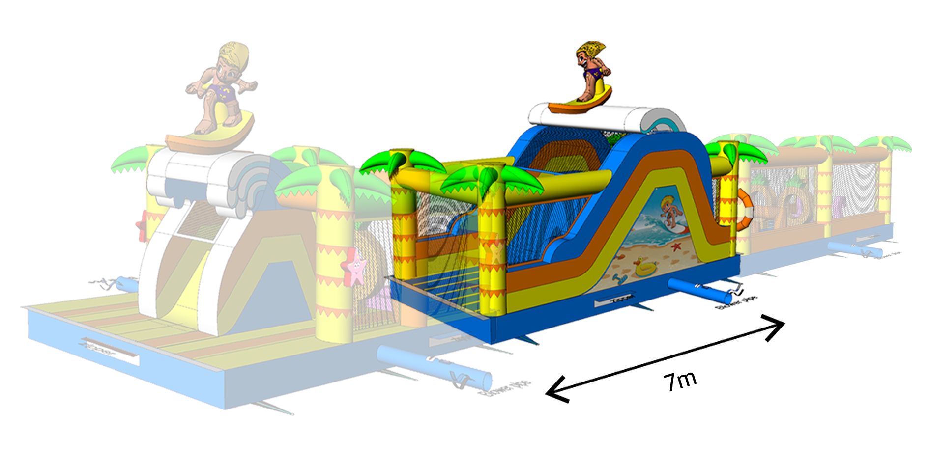 Aan de korte zijde van 4meter aan beide kanten kan een ander onderdeel worden aangesloten. Dit is duidelijk op de foto, het springkasteel dat minder zichtbaar is, is ter illustratie.