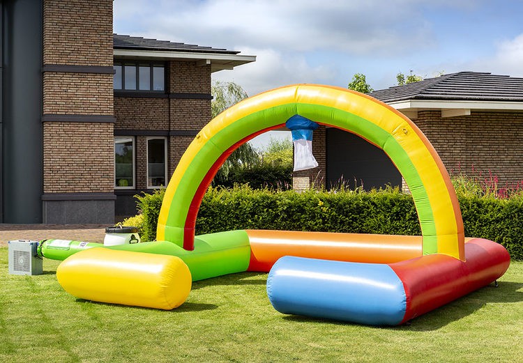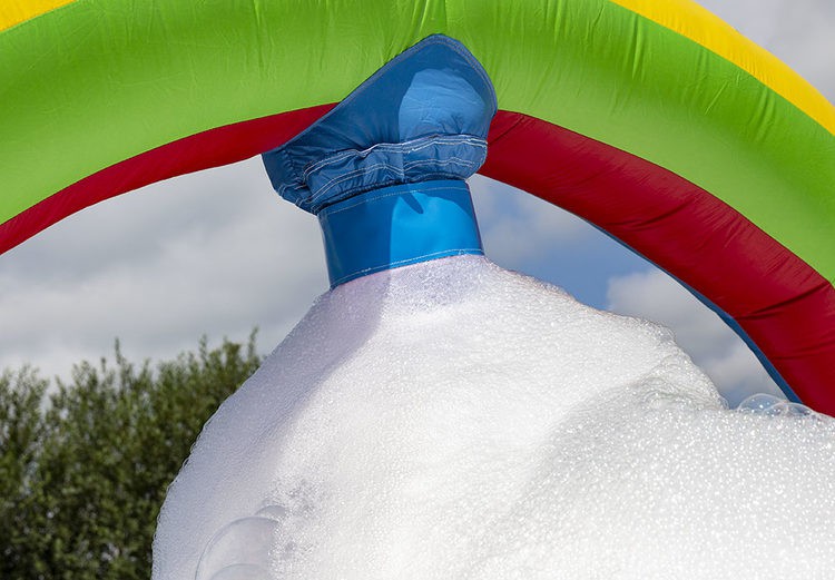 Het Bubble Park in thema regenboog creëert zijn eigen feestelijke schuim via een schuimkraan aan de achterzijde. Deze schuimkraan is door de gebruiker makkelijk in en uit te schakelen voor het vullen van de boarding. De vorm van de boarding zorgt ervoor dat het schuim zoveel mogelijk op één plek blijft. Zo spelen de kinderen op een veilige en spannende manier met schuim. De Bubble Parks zijn zeer makkelijk en snel te plaatsen op een grasveld achter in de tuin en daarom ook uitermate geschikt voor kinderfeestjes.