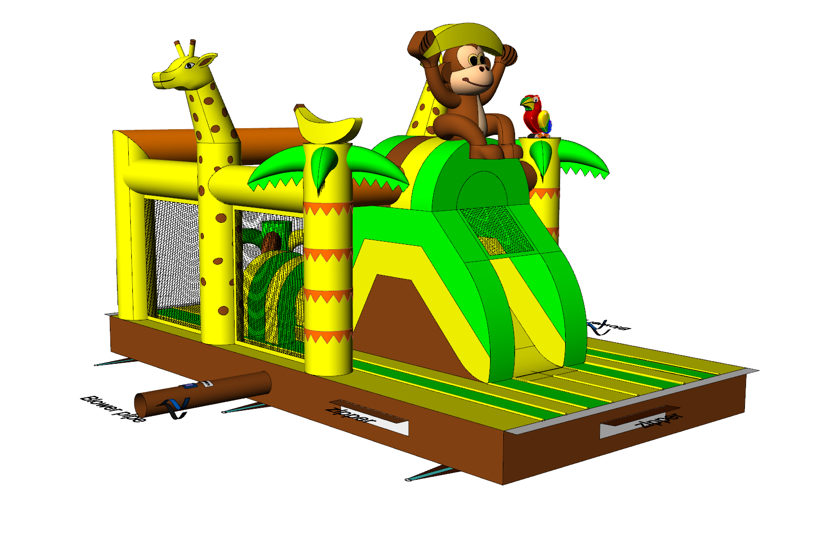 Met zijn 7m lang is het een springkasteel waar je langs 2 kanten kan instappen. Aan 1 kant heb je leuke en originele obstakels in thema, aan de andere kant heb je een glijbaan. Voor ieder wat wils en gegarandeerd uren speelplezier!