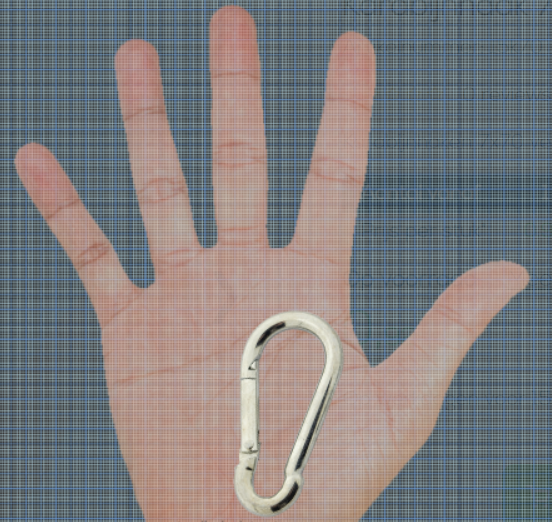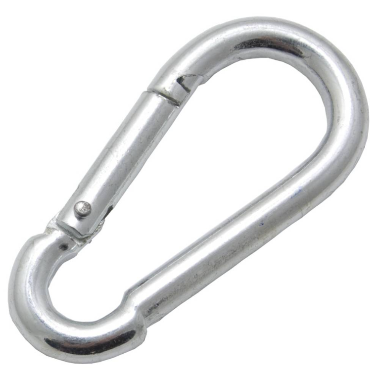 Wij voorzien een musketon van 7cm lang en 7mm dik in verzinkt ijzer waardoor je het gewicht eenvoudig kan inhaken aan een lus van het product dewelke je wil vast hangen.