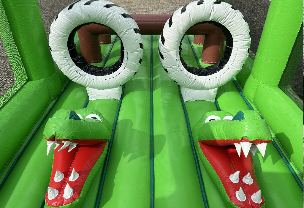 Aan de korte zijde van 4meter aan beide kanten kan een ander onderdeel worden aangesloten. Dit is duidelijk op de foto, het springkasteel dat minder zichtbaar is, is ter illustratie.