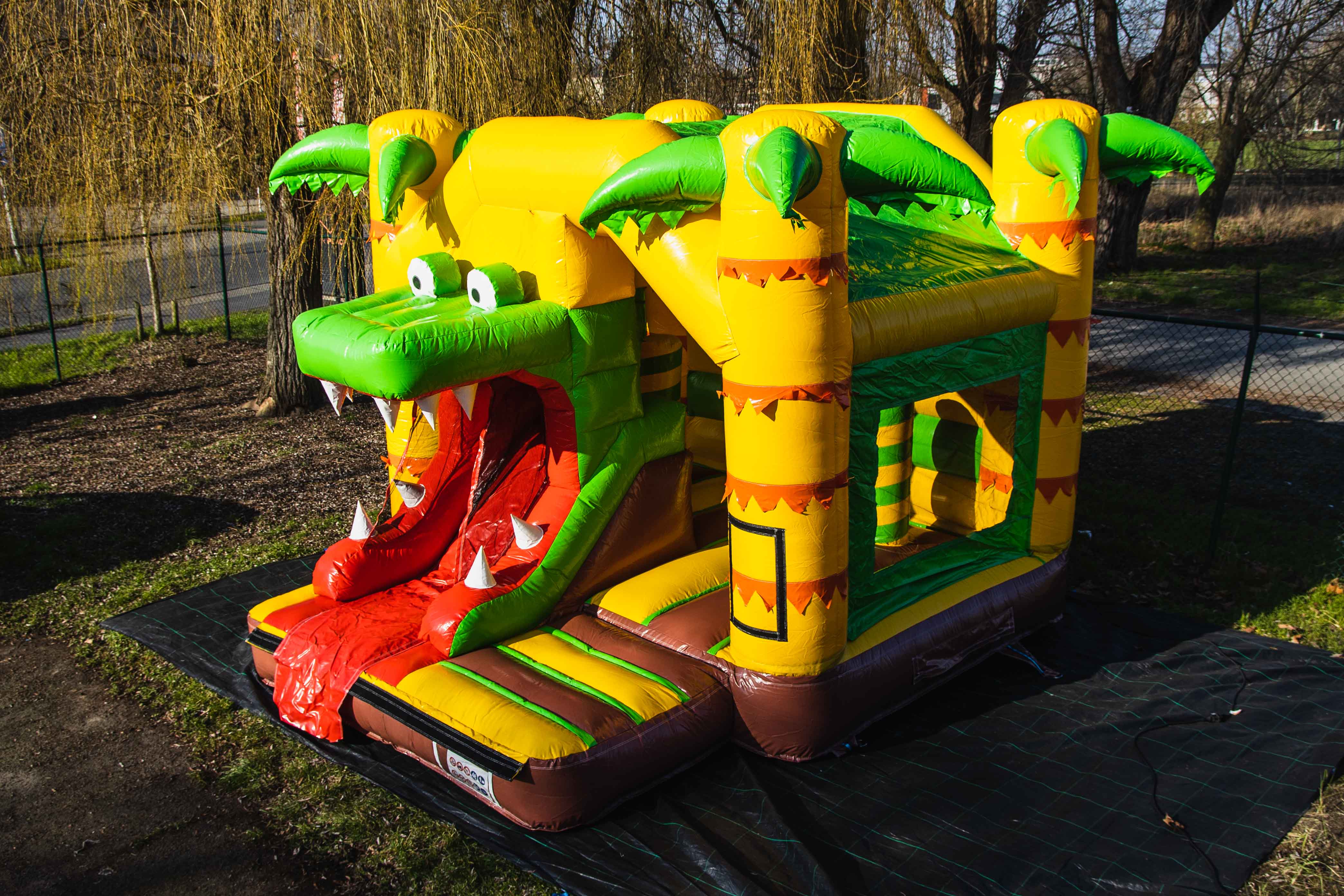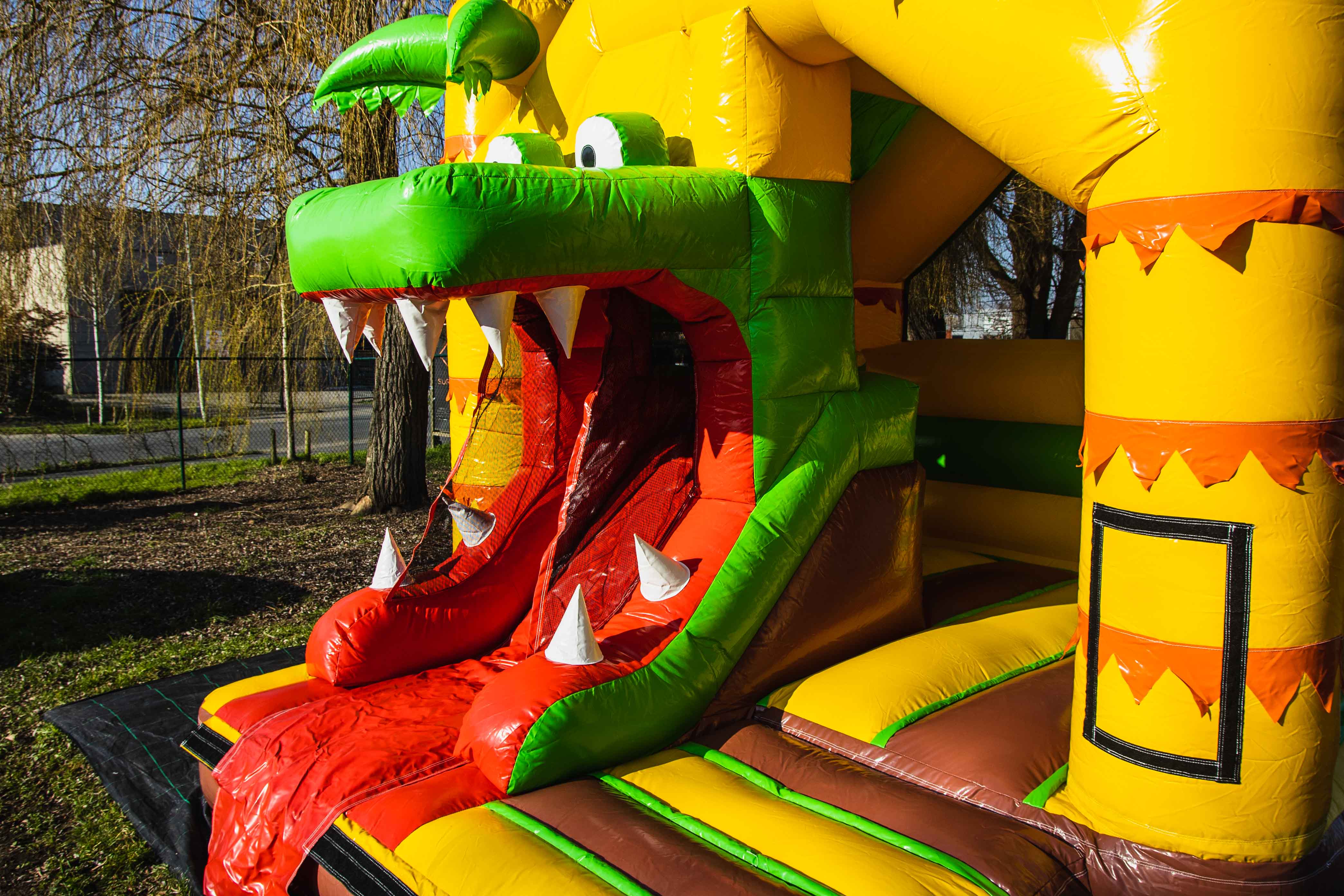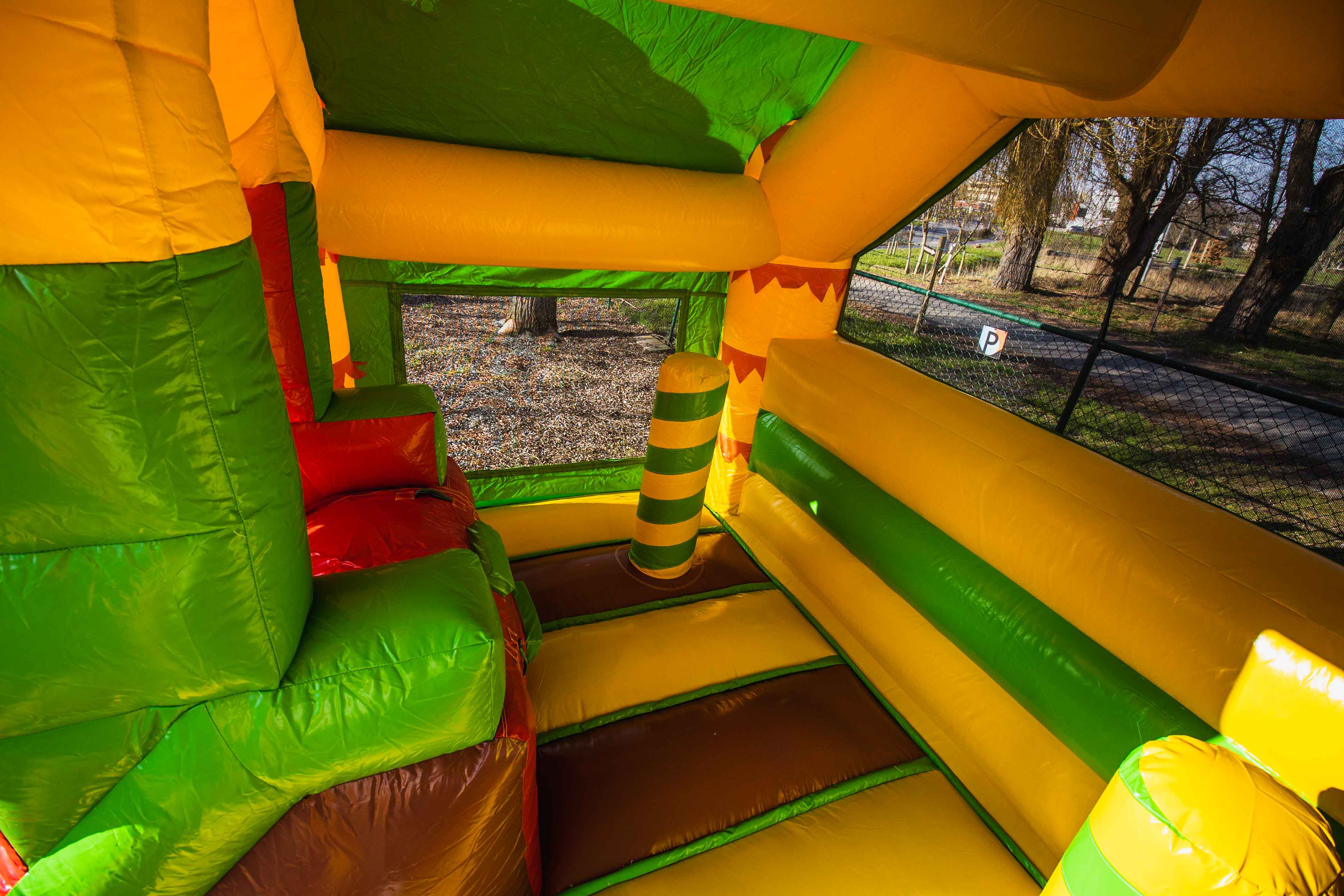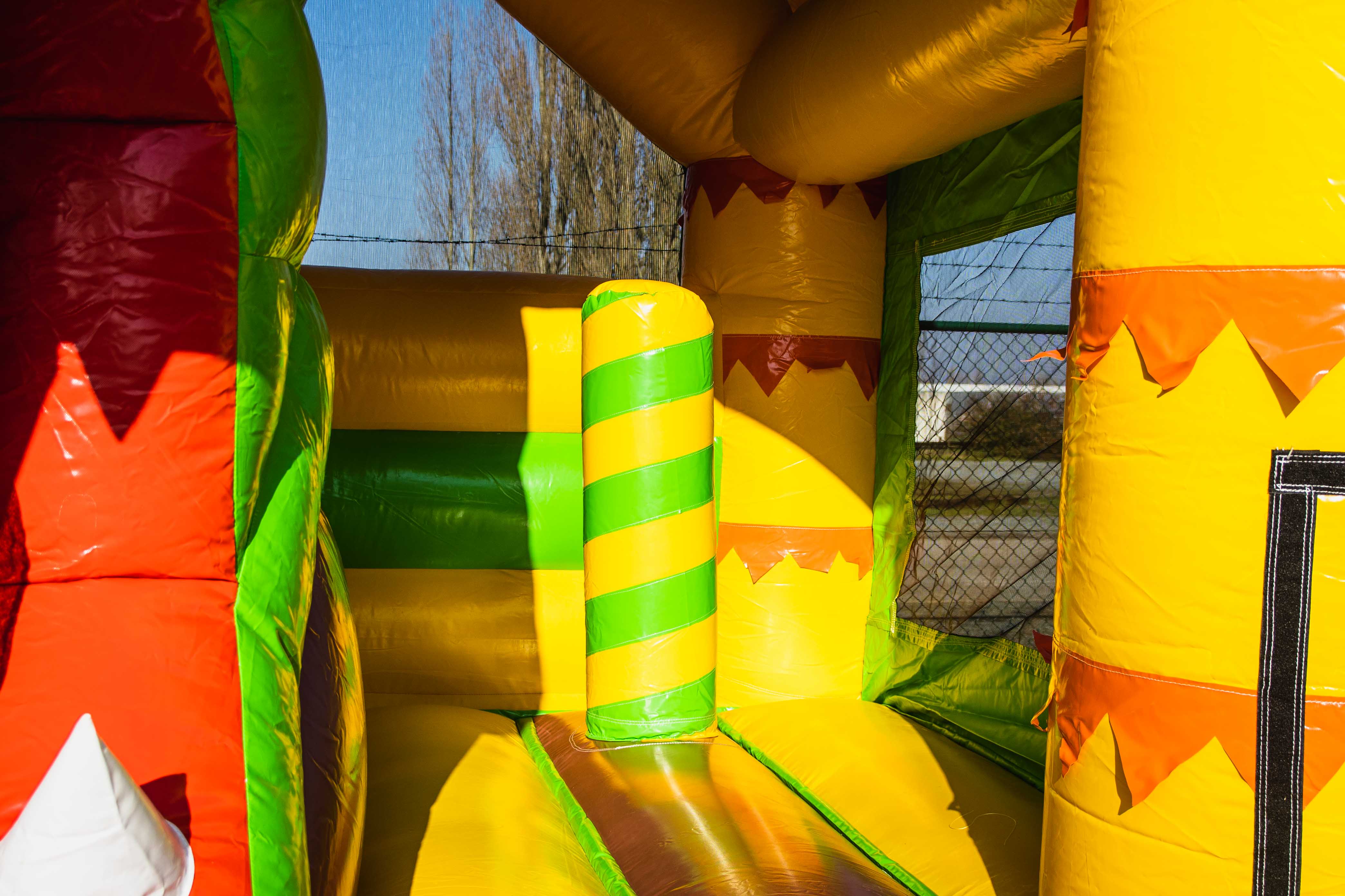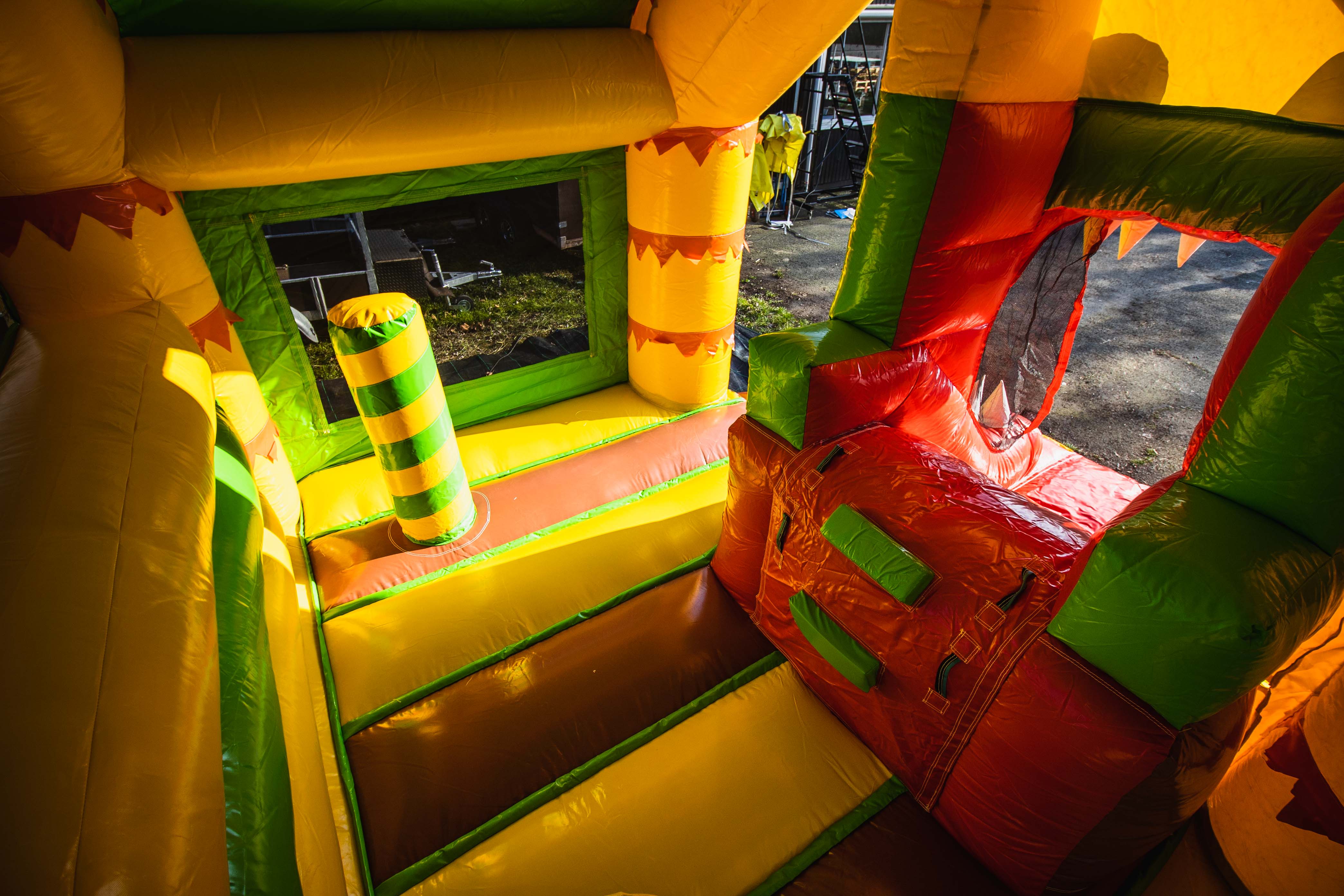 Het springkussen heeft een glijbaan aan de voorkant en meerdere obstakels binnenin het kasteel.