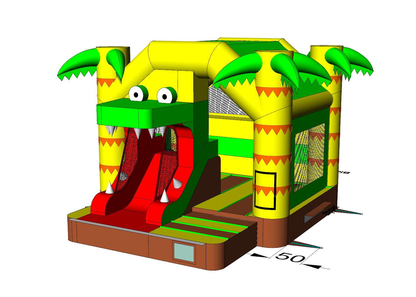 Aan de voorste zijde van 3m90 kan een ander onderdeel worden aangesloten. Dit is duidelijk op de foto, het springkasteel dat minder zichtbaar is, is ter illustratie.