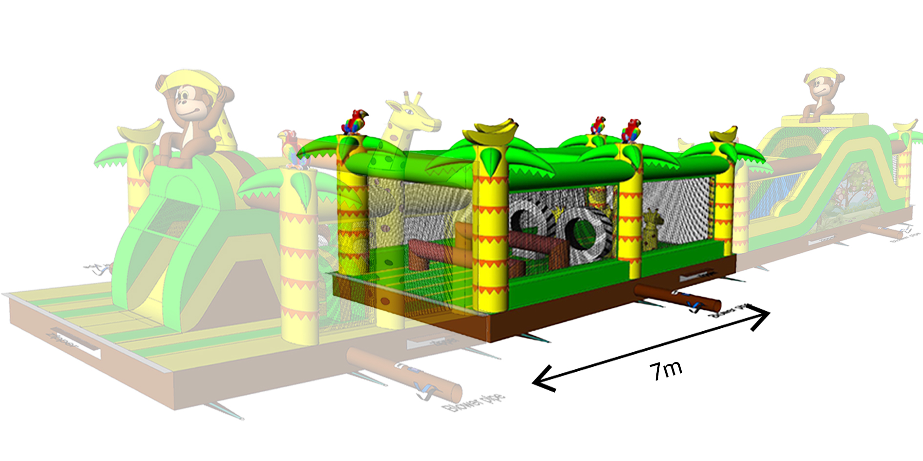 Aan de korte zijde van 4meter aan beide kanten kan een ander onderdeel worden aangesloten. Dit is duidelijk op de foto, het springkasteel dat minder zichtbaar is, is ter illustratie.