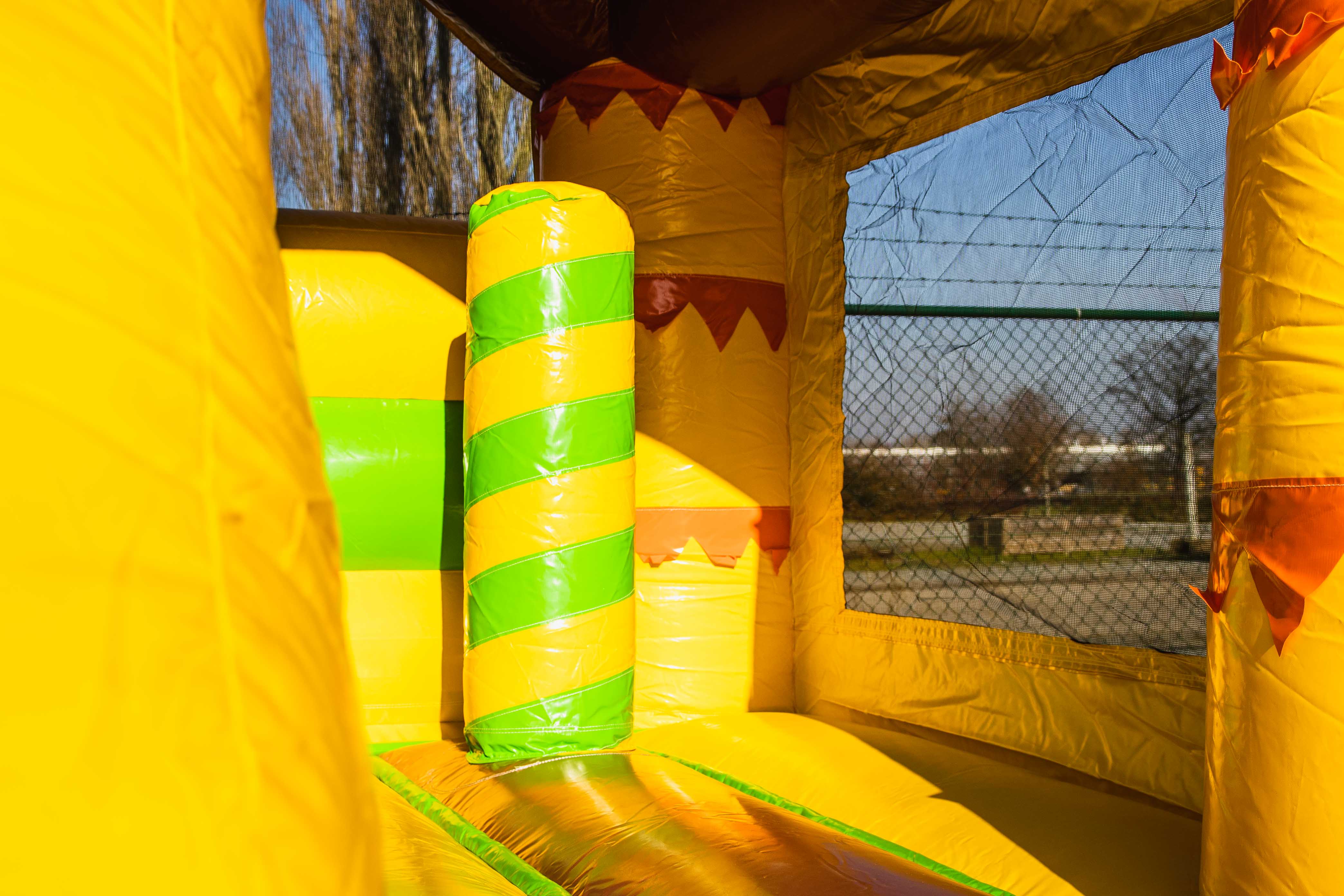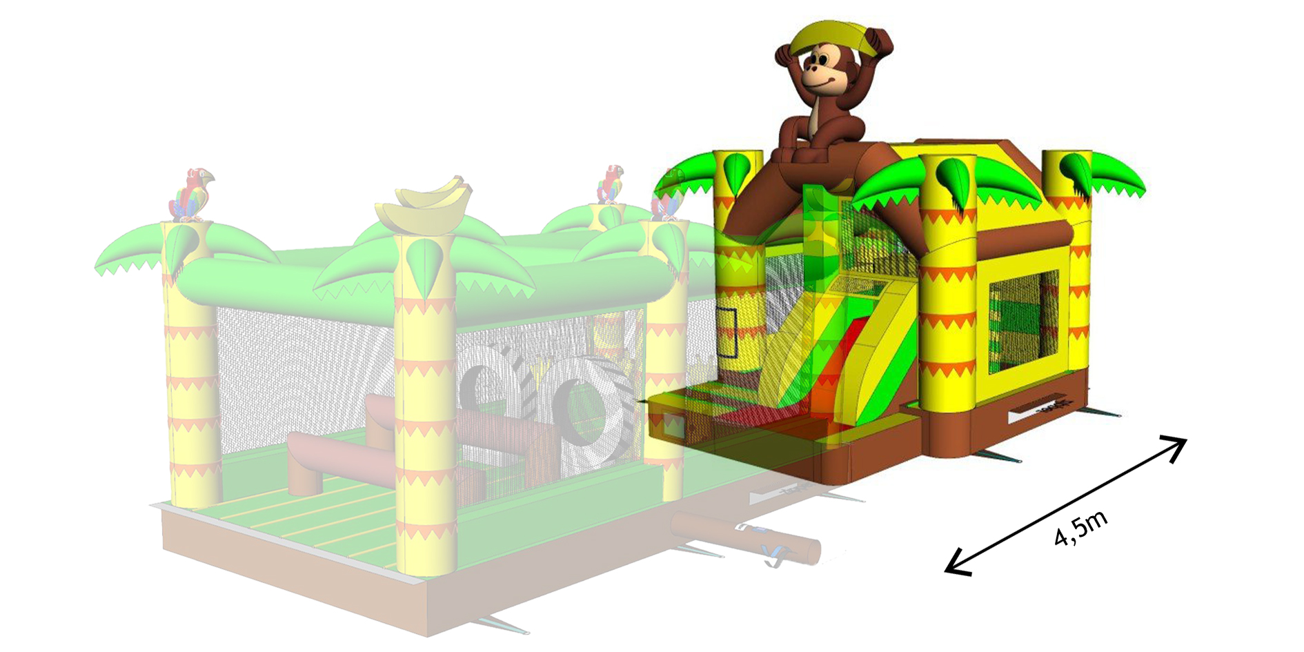 Aan de voorste zijde van 3m90 kan een ander onderdeel worden aangesloten. Dit is duidelijk op de foto, het springkasteel dat minder zichtbaar is, is ter illustratie.
