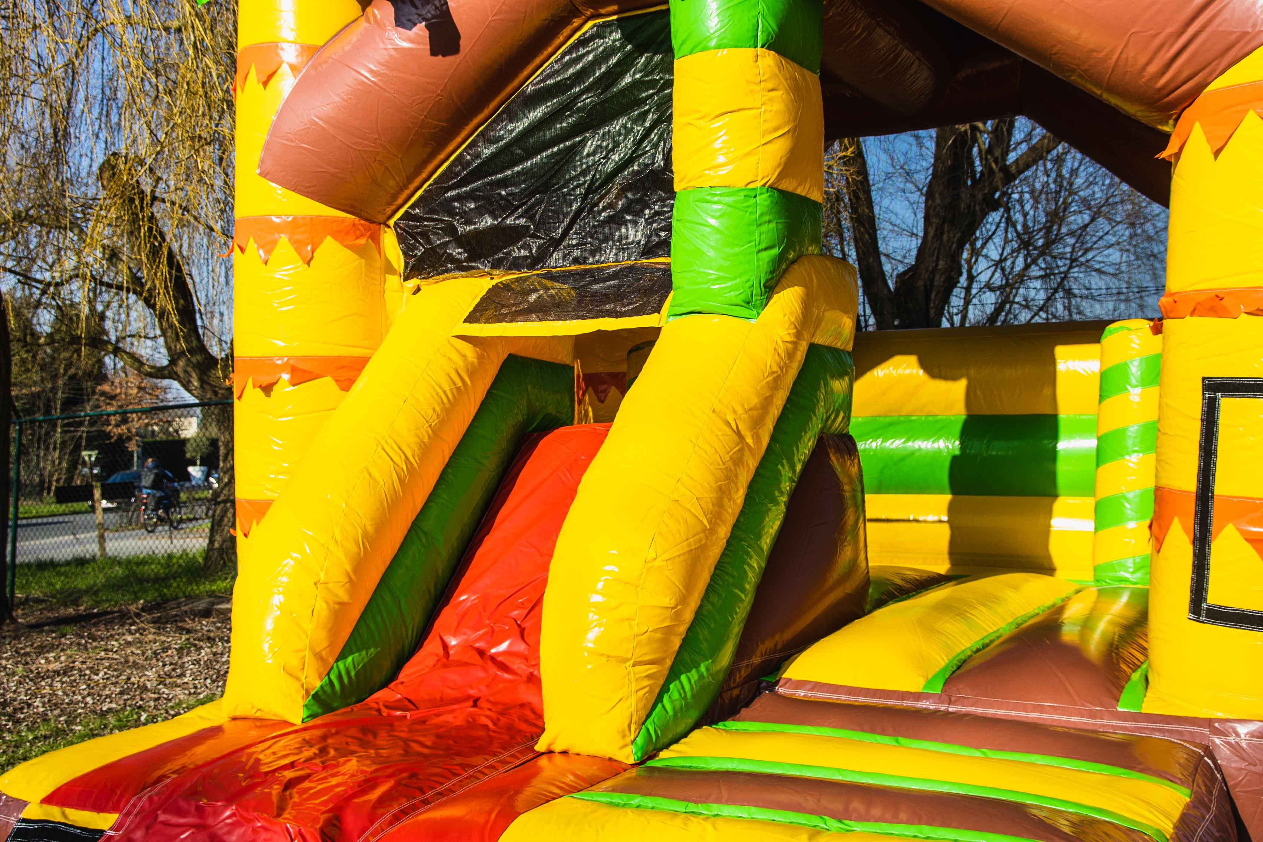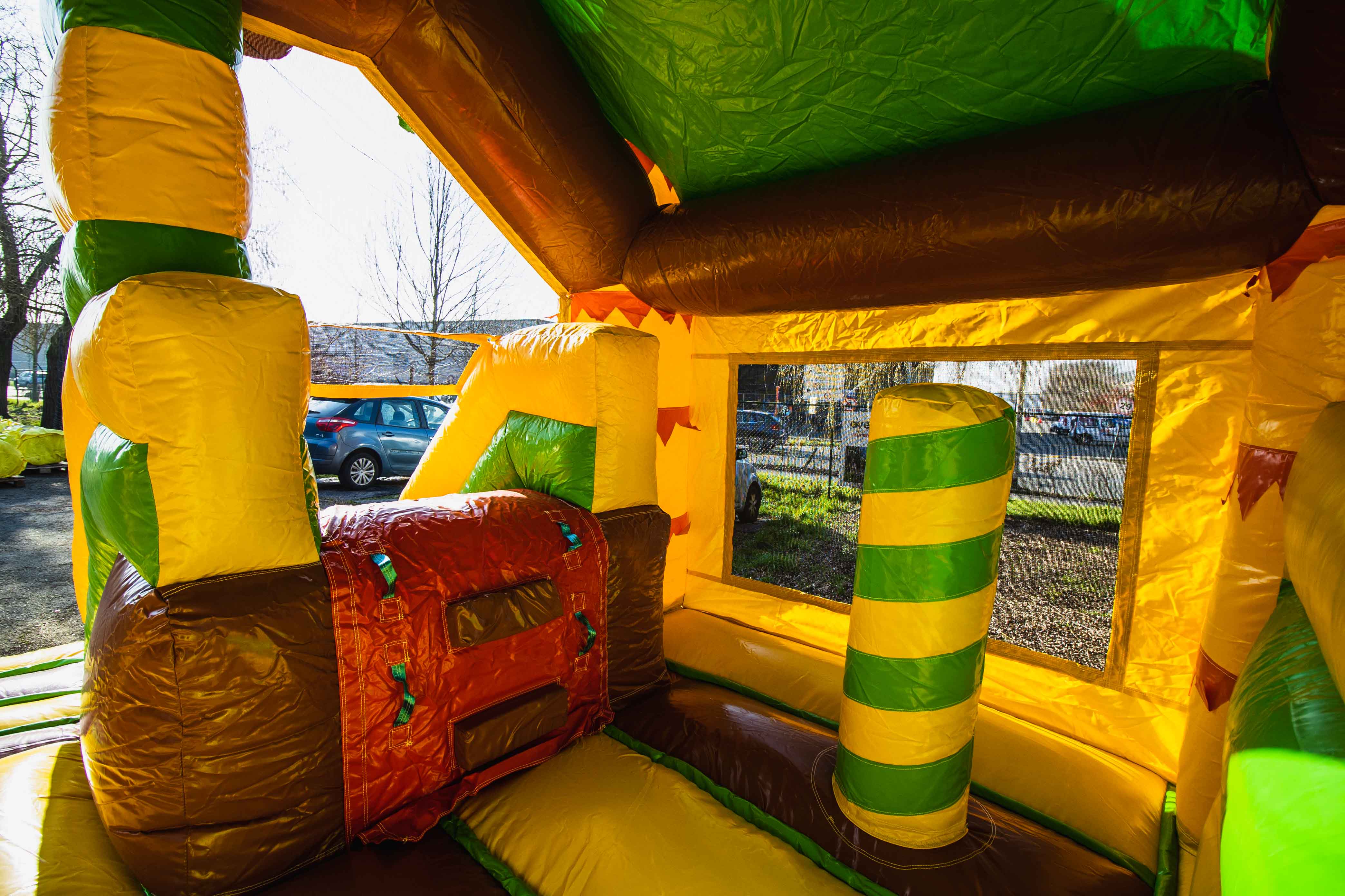 Het springkussen heeft een glijbaan aan de voorkant en meerdere obstakels binnenin het kasteel.