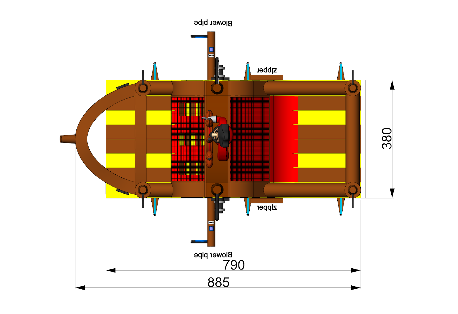 Aan beide zijde van de 7m kan de blower van 1100 watt aangesloten worden aan een luchtslang die in het midden uitkomt (zie foto) . Zo kan je zelf kiezen waar je deze aansluit in functie van waar de kindjes rond het kasteel lopen, in functie van waar er plaats is op de locatie, ... .