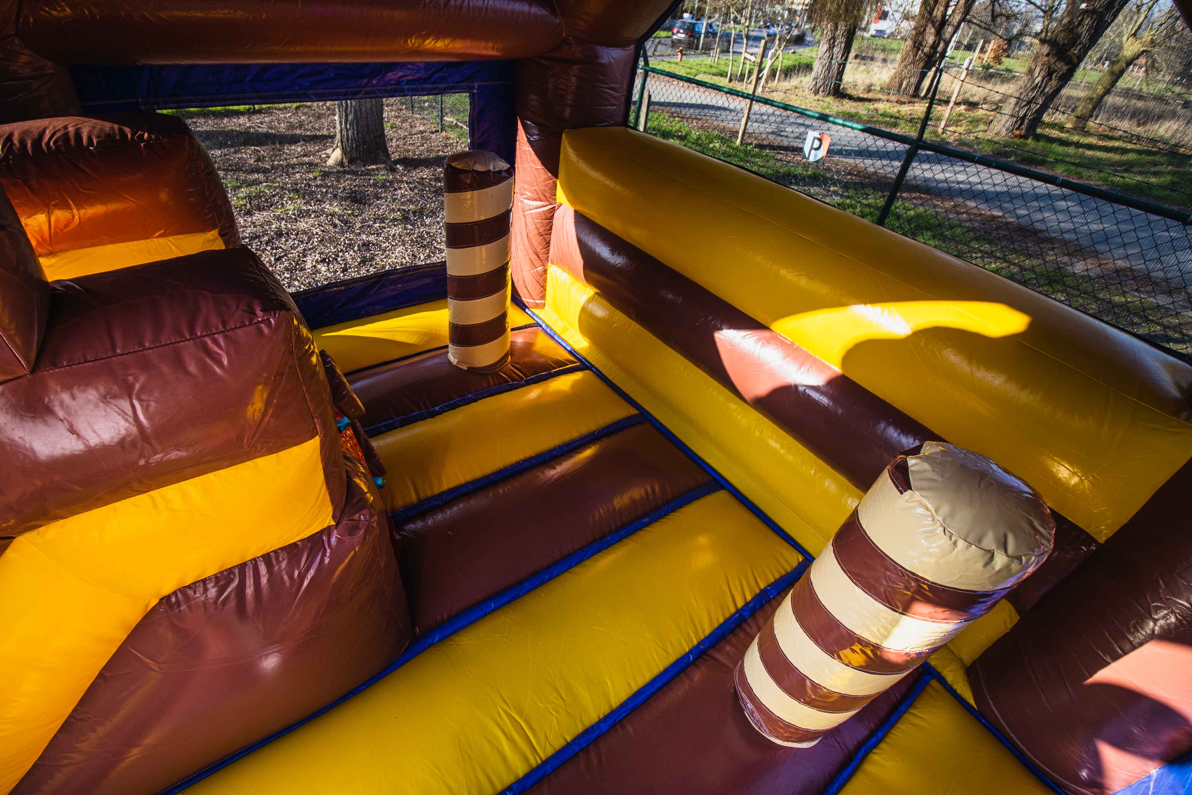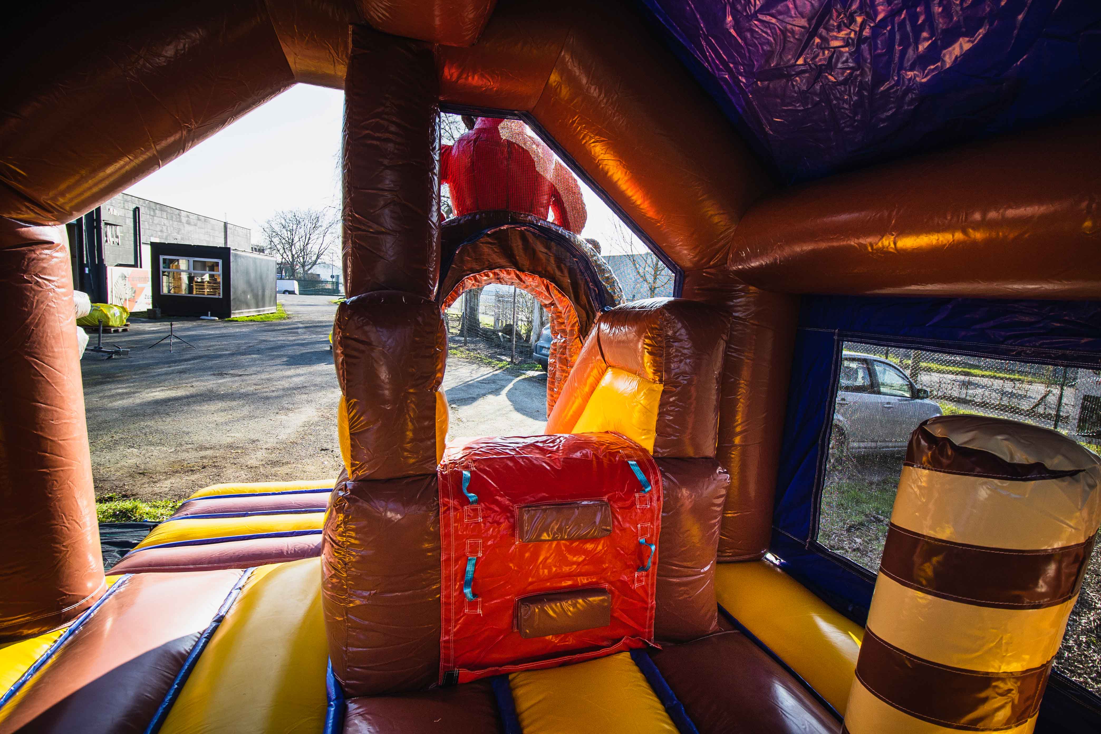 Het springkussen heeft een glijbaan aan de voorkant en meerdere obstakels binnenin het kasteel.