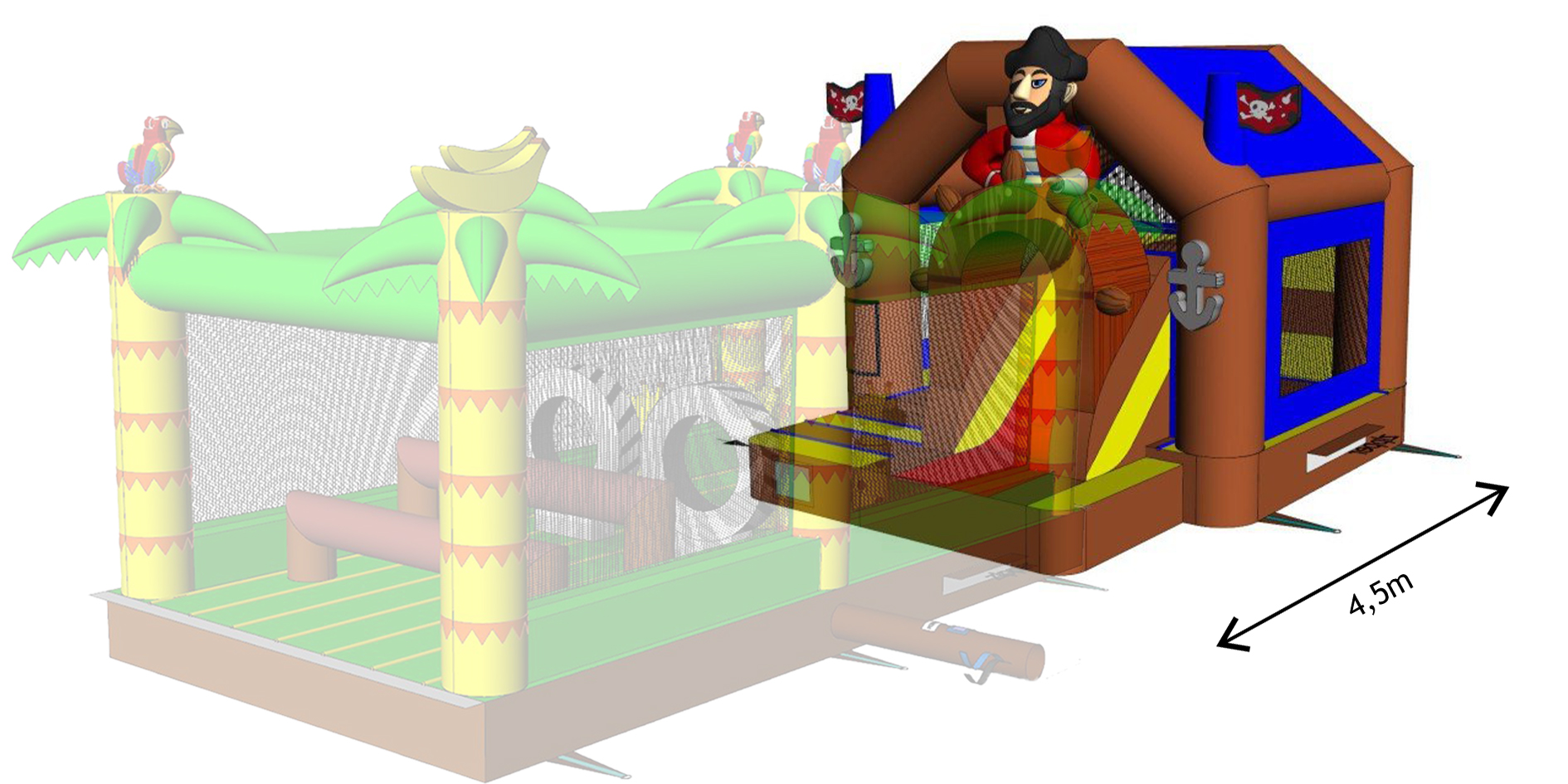 Aan de voorste zijde van 3m90 kan een ander onderdeel worden aangesloten. Dit is duidelijk op de foto, het springkasteel dat minder zichtbaar is, is ter illustratie.