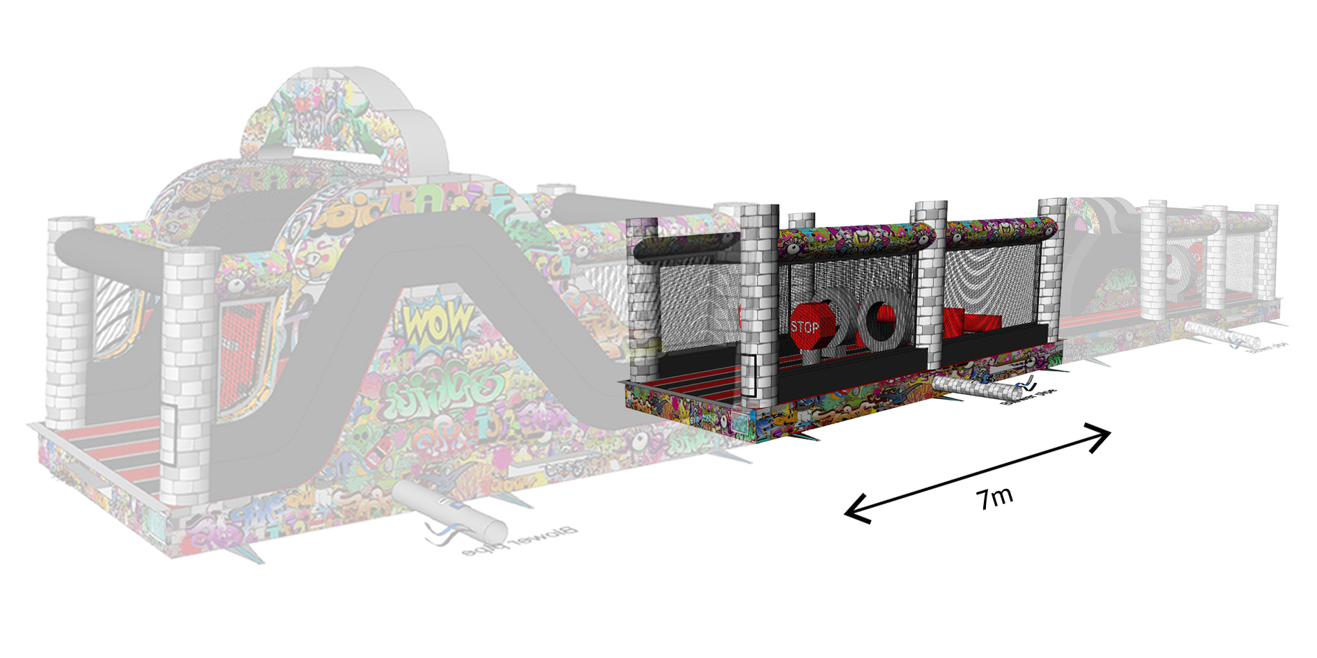 Aan de korte zijde van 4meter aan beide kanten kan een ander onderdeel worden aangesloten. Dit is duidelijk op de foto, het springkasteel dat minder zichtbaar is, is ter illustratie.