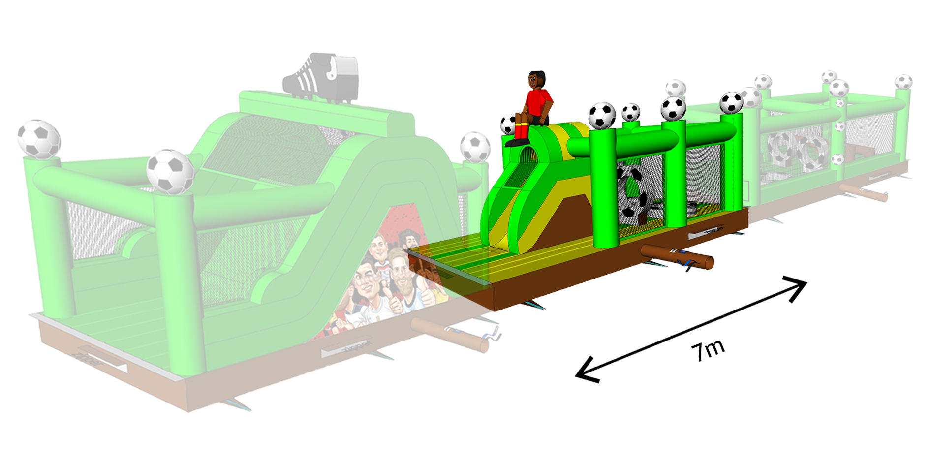 Aan de korte zijde van 4meter aan beide kanten kan een ander onderdeel worden aangesloten. Dit is duidelijk op de foto, het springkasteel dat minder zichtbaar is, is ter illustratie.