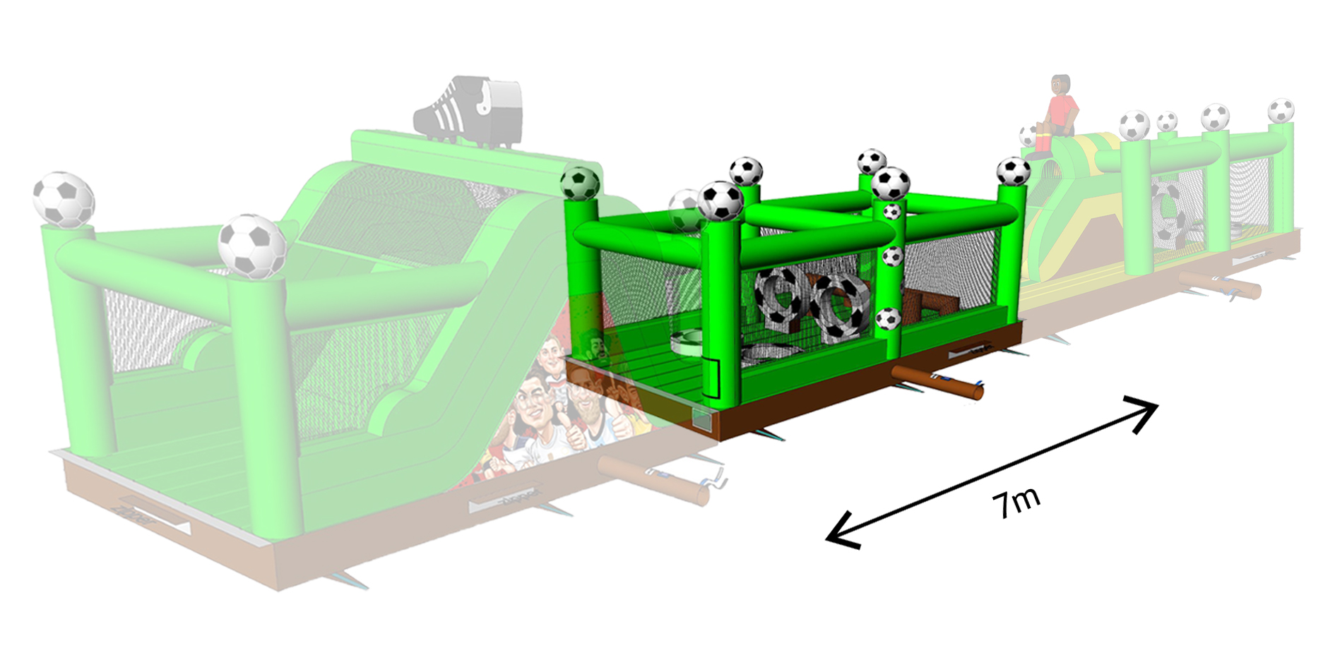 Aan de korte zijde van 4meter aan beide kanten kan een ander onderdeel worden aangesloten. Dit is duidelijk op de foto, het springkasteel dat minder zichtbaar is, is ter illustratie.
