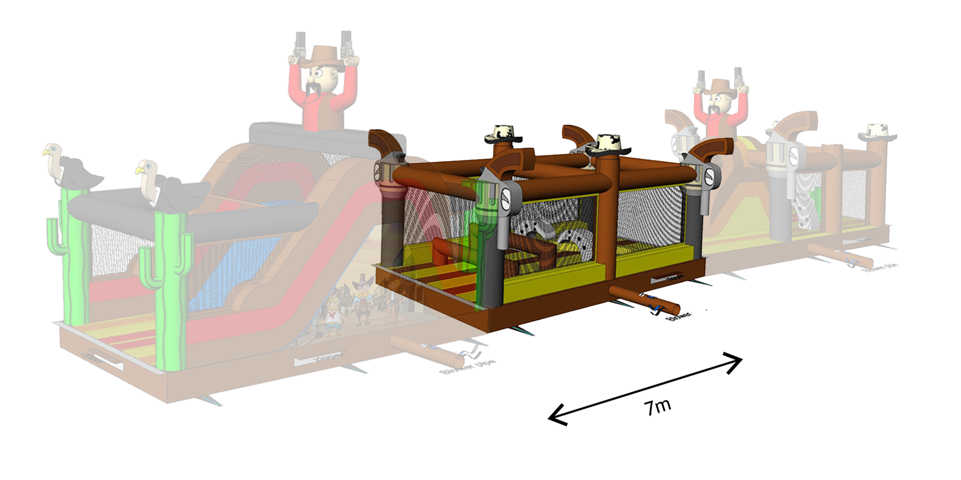 Aan de korte zijde van 4meter aan beide kanten kan een ander onderdeel worden aangesloten. Dit is duidelijk op de foto, het springkasteel dat minder zichtbaar is, is ter illustratie.