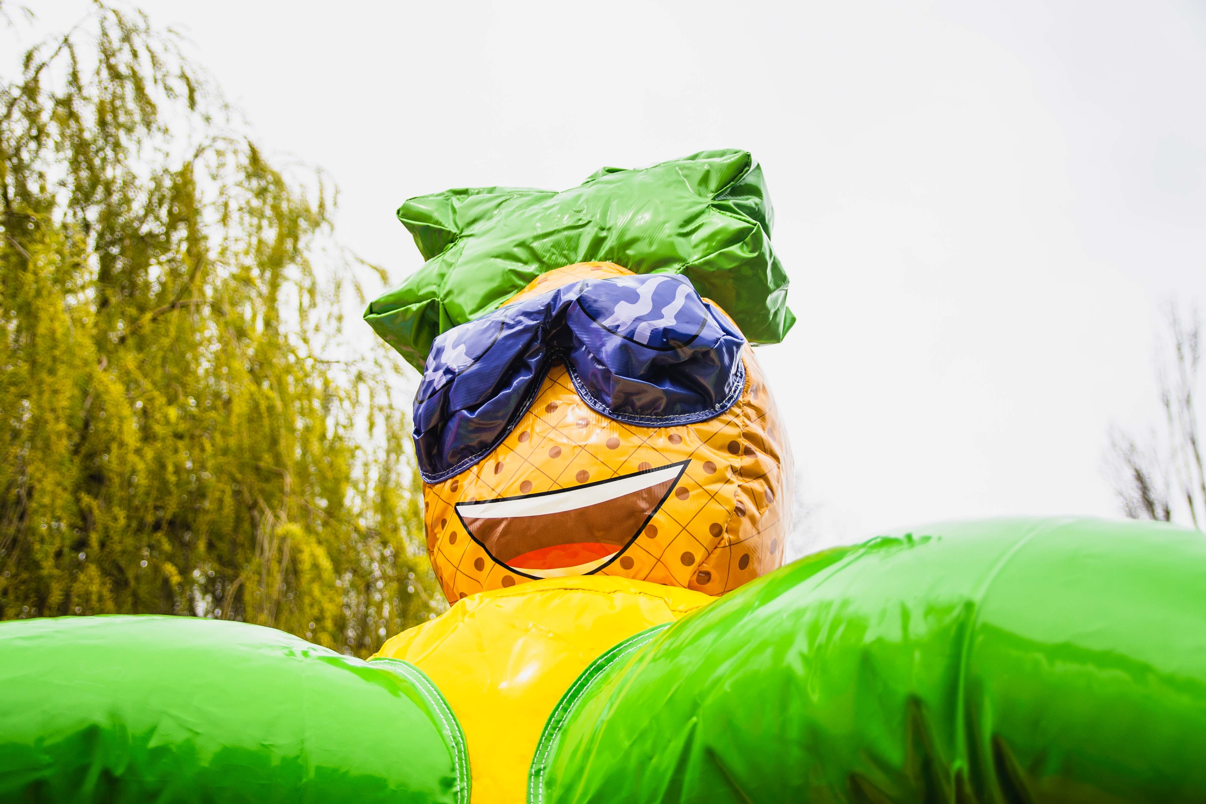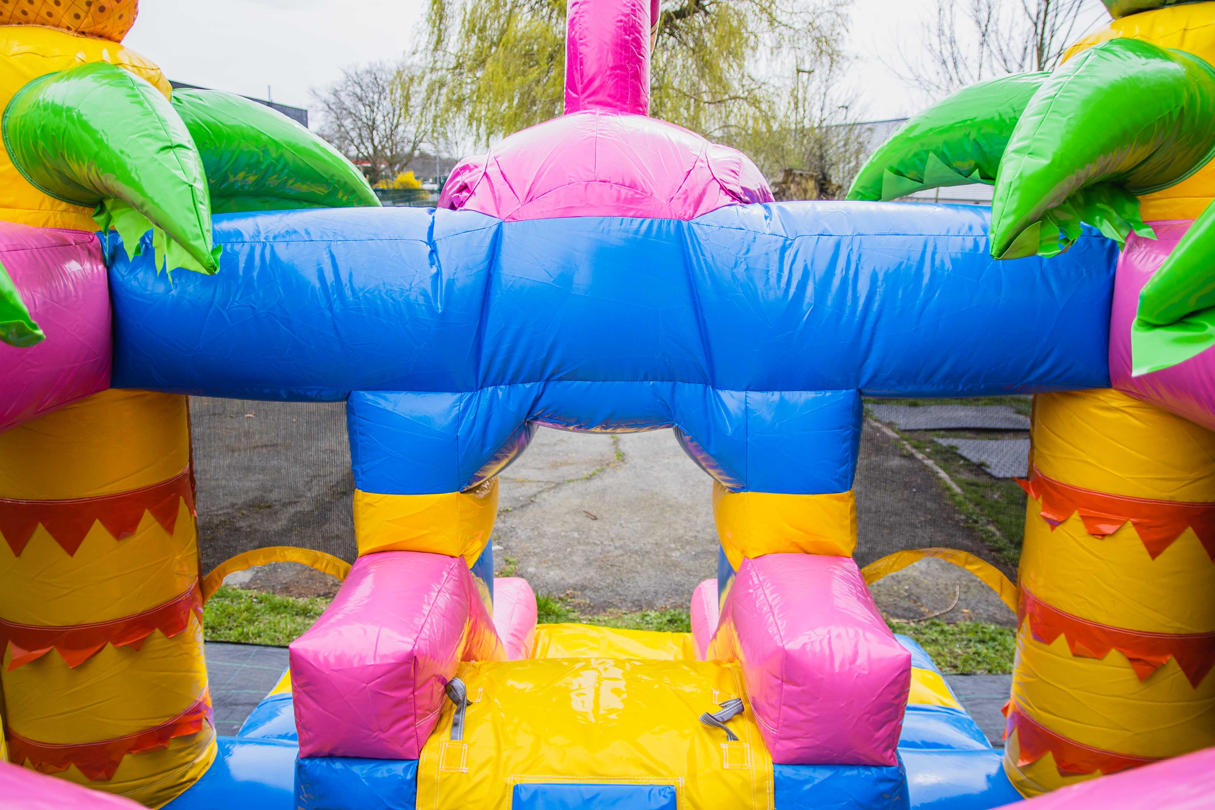 We hebben bewust gekozen voor geen dak omdat dit bij regen eigenlijk geen verschil maakt, het springkasteel zo lichter is in transport en het minder hoog is om onder een boom of in een zaal te plaatsen. Elk springkasteel, ook met dak wordt met regen binnenin nat. Onze ervaring leert ons dat je als huurder/ organisator vaak iets te veel “schrik” hebt van regen tijdens je feest. En dat herkennen wij zelf ook als we een feestje organiseren. In praktijk zien we echter echter, dat ook op dagen dat er gigantisch veel regen voorspeld wordt, het aantal minuten dat het echt regent tijdens je feest achteraf altijd meevalt. En ook ondanks wat regen is het plezier met het springkasteel niet minder. In het slechtste geval springen de kids niet op het kasteel als het regent (geloof me, dat vinden ze vaak ook plezant) en neem je enkele handdoeken als de bui over is, het kasteel is binnen de 2 minuten opnieuw droog om weer voluit te springen.
