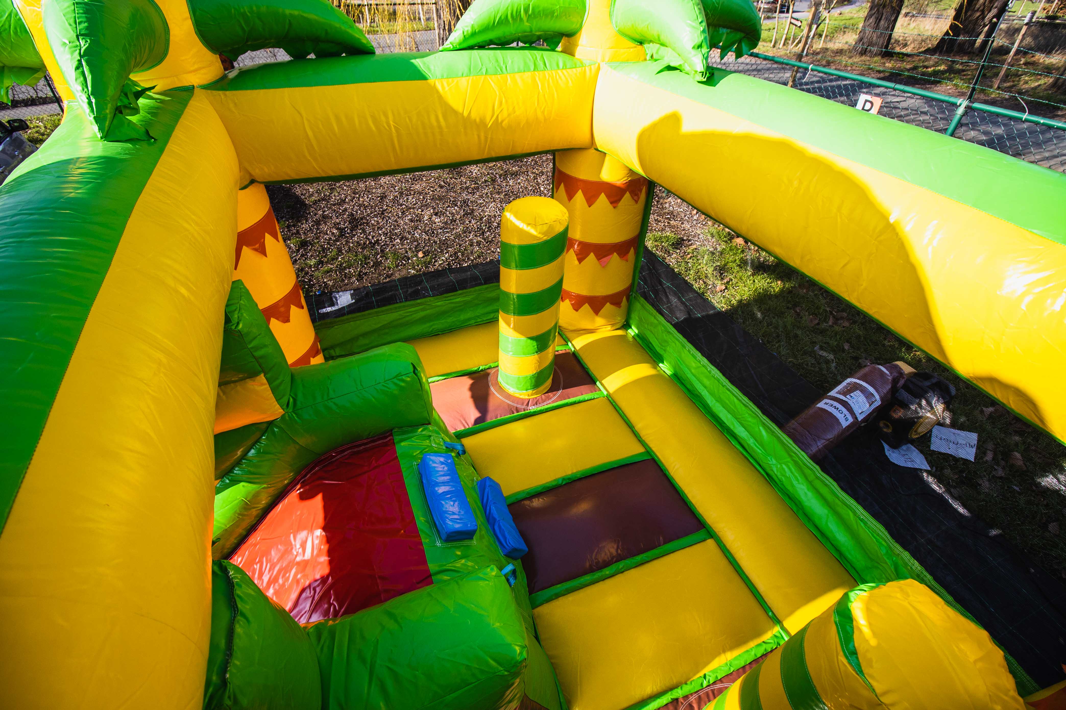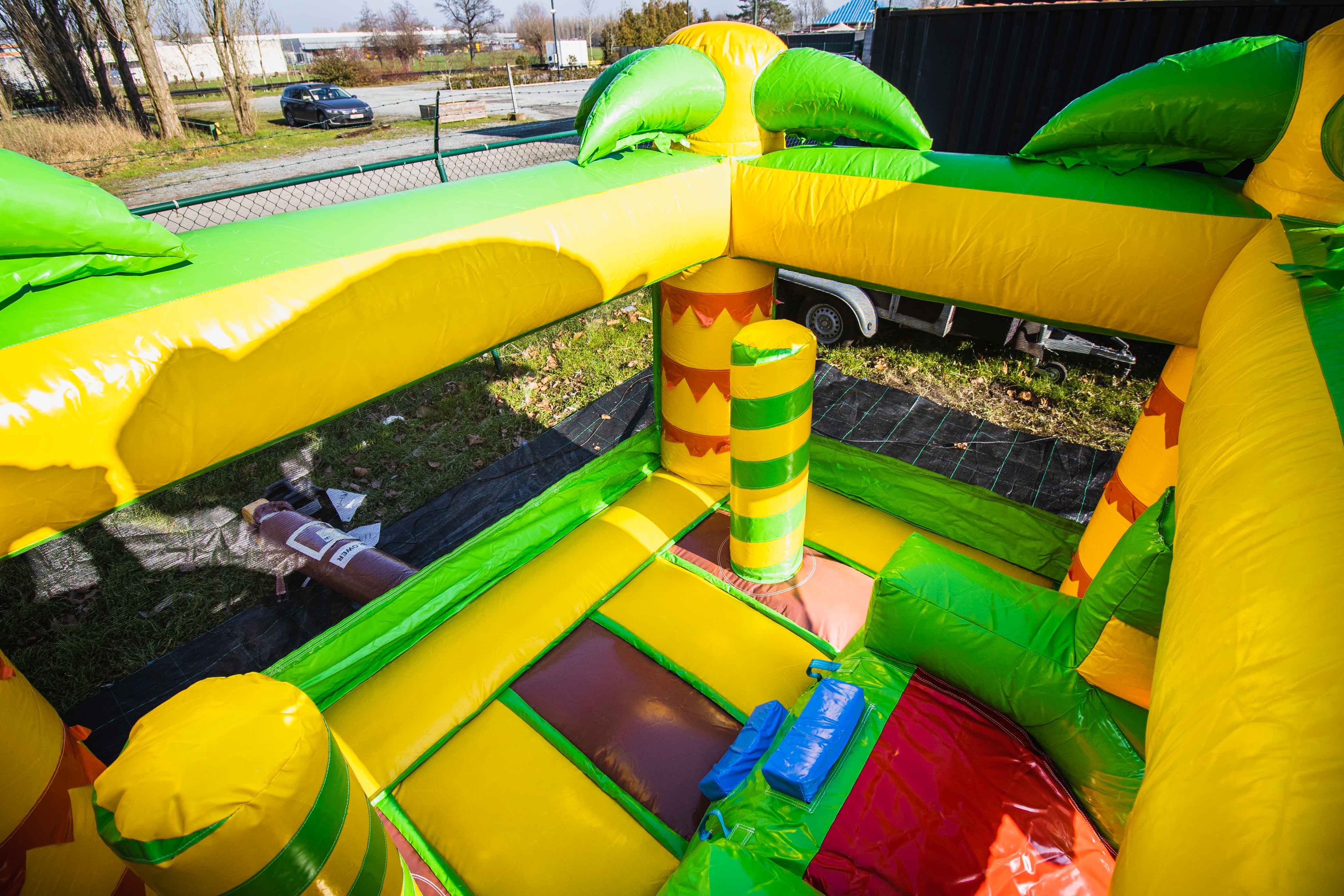 - 1m vrije ruimte rondom het springkasteel, achteraan 2 meter voor de luchtslang en de blower