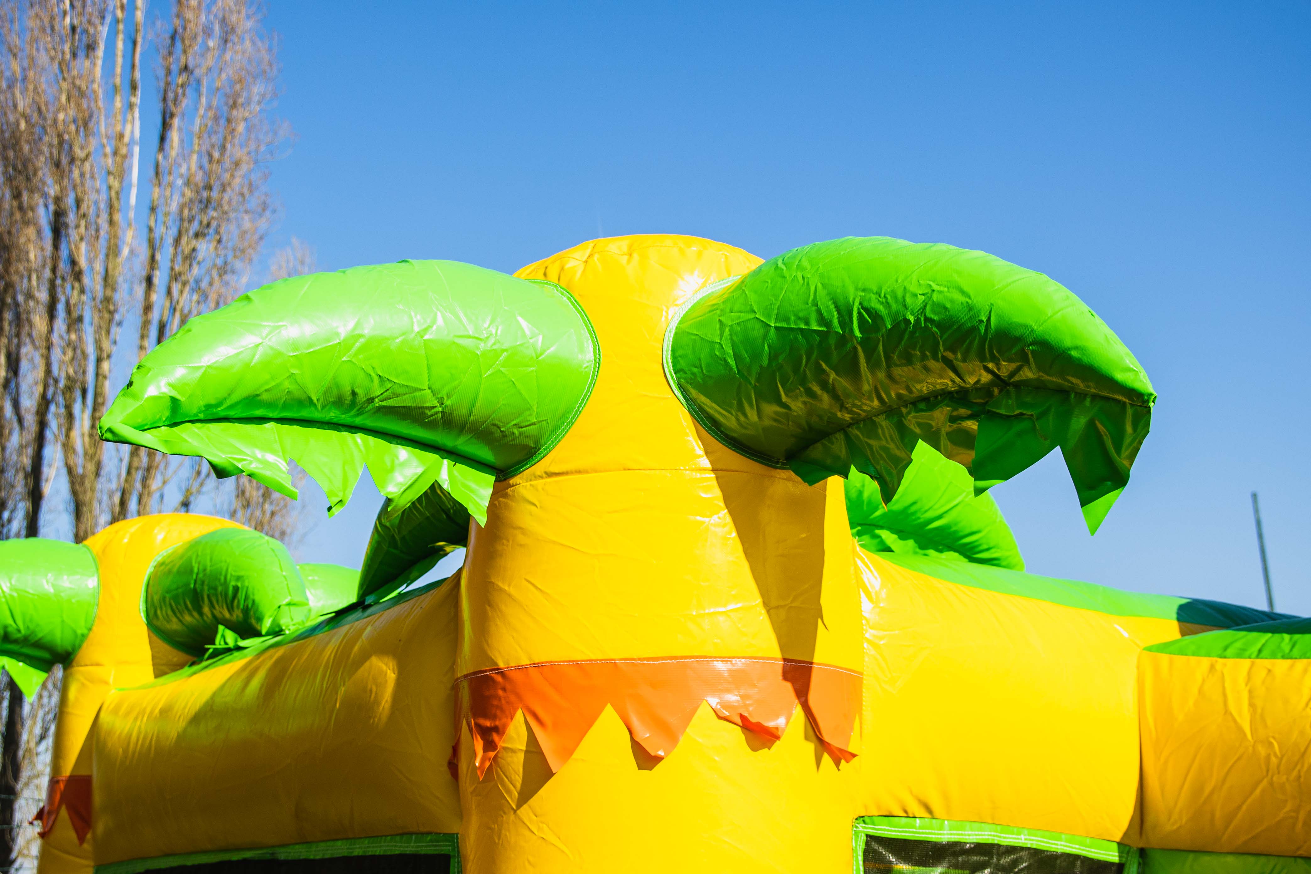 We hebben bewust gekozen voor geen dak omdat dit bij regen eigenlijk geen verschil maakt, het springkasteel zo lichter is in transport en het minder hoog is om onder een boom of in een zaal te plaatsen. Elk springkasteel, ook met dak wordt met regen binnenin nat. Onze ervaring leert ons dat je als huurder/ organisator vaak iets te veel “schrik” hebt van regen tijdens je feest. En dat herkennen wij zelf ook als we een feestje organiseren. In praktijk zien we echter echter, dat ook op dagen dat er gigantisch veel regen voorspeld wordt, het aantal minuten dat het echt regent tijdens je feest achteraf altijd meevalt. En ook ondanks wat regen is het plezier met het springkasteel niet minder. In het slechtste geval springen de kids niet op het kasteel als het regent (geloof me, dat vinden ze vaak ook plezant) en neem je enkele handdoeken als de bui over is, het kasteel is binnen de 2 minuten opnieuw droog om weer voluit te springen.