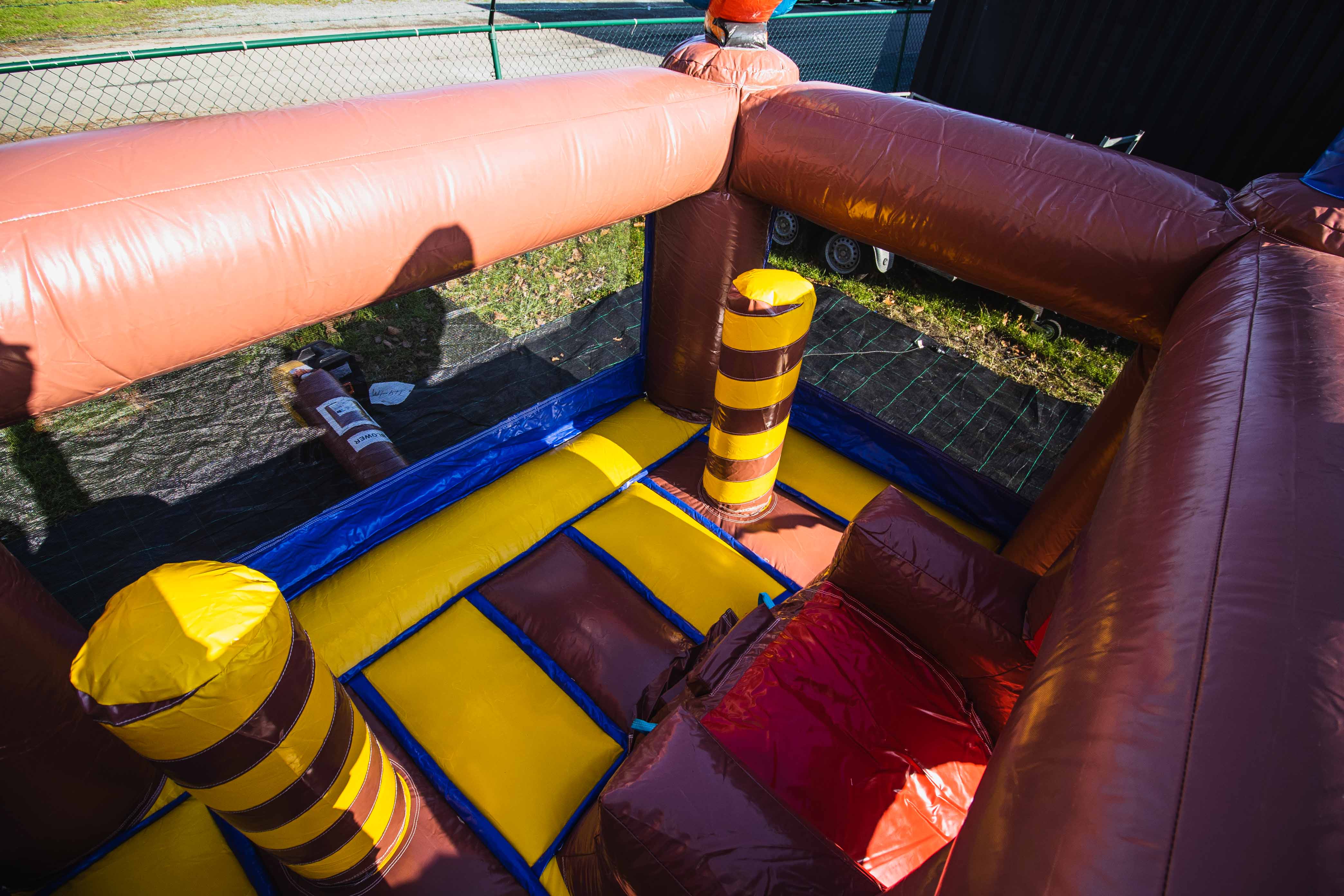 Het springkussen wordt door de kleine helden links en rechts van de glijbaan betreedt; Binnenin vinden ze een springoppervlak en een leuk obstakel om mee te spelen, op te springen of tegen te “boksen”. Ze kunnen via de glijbaan opnieuw op de leukste manier uit het springkasteel glijden! Plezier verzekerd!