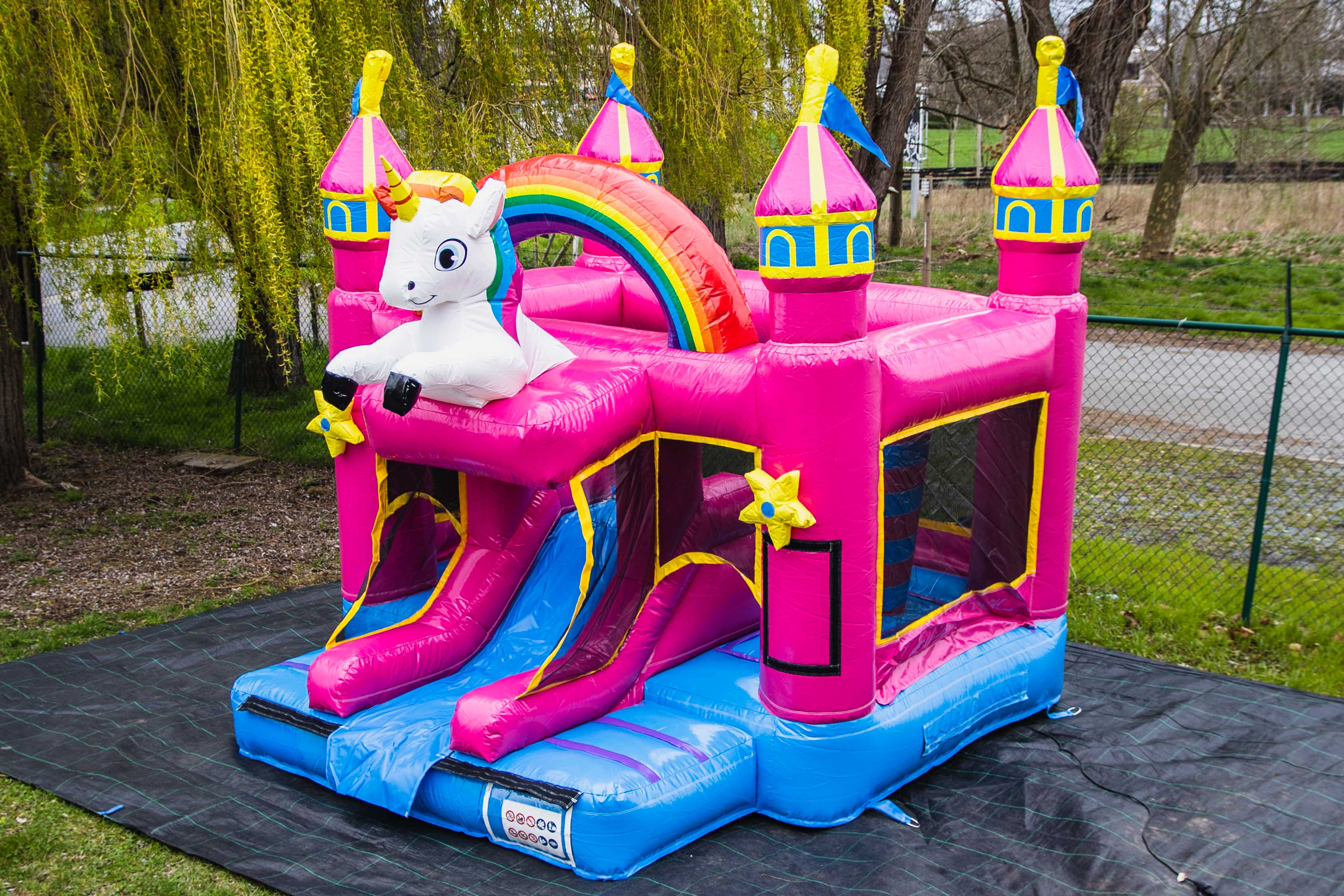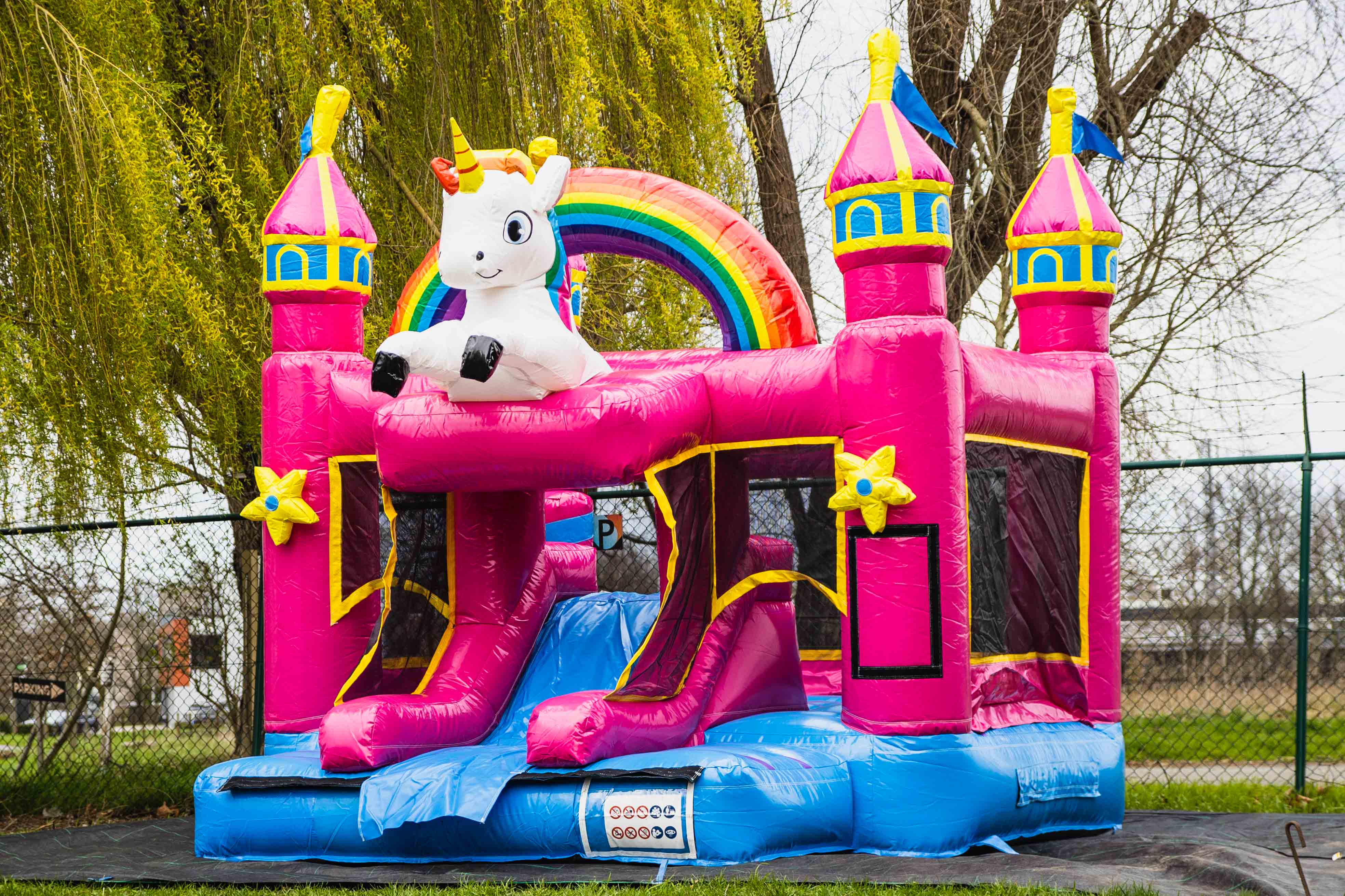 Voor de verhuur van unicorn springkastelen moet je bij Eventa Rent zijn! Super populair, ons unicorn springkasteel. Een hype die een echte blijver is geworden voor de prinsessen onder ons. Een roos unicorn springkasteel huren zorgt dan ook werkelijk dat je tuin in een handomdraai wordt omgetoverd in een roze sprookjestuin. Springen en glijden in het eenhoorn kasteel. Het kan allemaal.