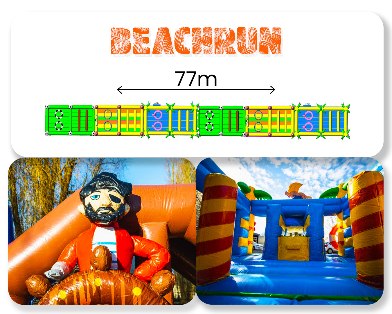 Op zoek naar een zomerse uitdaging voor jouw evenement? Onze GIGA Beachrun is de perfecte keuze! Met 77 meter aan avontuur en obstakels is deze attractie ideaal voor kinderen en volwassenen. Klim naar boven op de klimtoren, zoef naar beneden op de glijbaan en baan je een weg door de uitdagende obstakels. Met het strandthema van deze attractie waan je jezelf meteen op een tropisch eiland. Ideaal voor zomerse feestjes en evenementen. Boek nu onze Beachrun en maak er een onvergetelijke dag van!