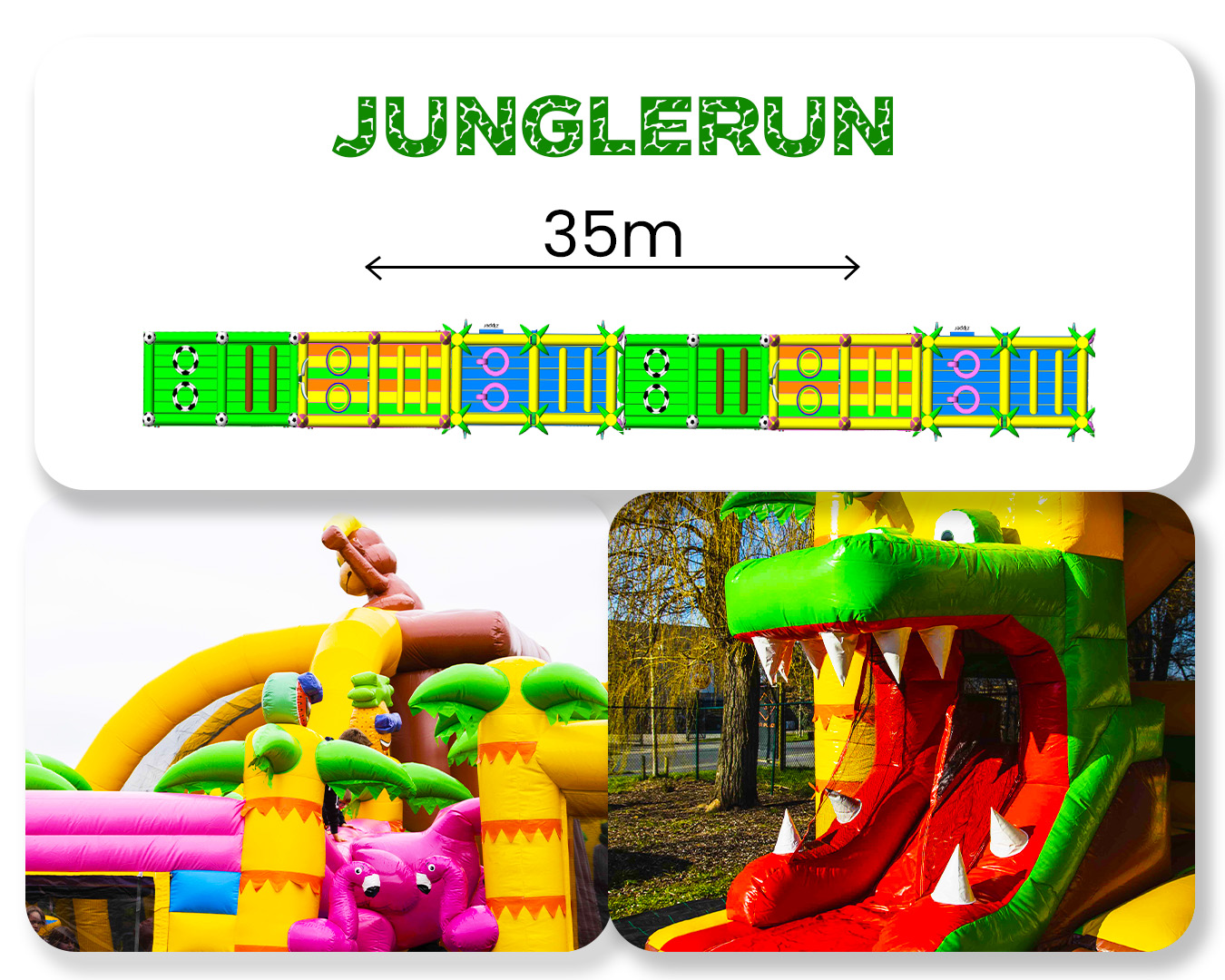 Ontdek de MEGA Junglerun van Eventa Rent: een spannend en uitdagend parcours van maar liefst 35 meter lang met een klimtoren, glijbaan en 21 meter aan obstakels. Laat je innerlijke avonturier los en test je vaardigheden op dit hindernissenparcours. Klim, klauter en glijd over de verschillende hindernissen en ervaar de jungle als nooit tevoren! De Junglerun is perfect voor evenementen, festivals, bedrijfsfeesten en nog veel meer. Huur de Junglerun vandaag nog en zorg voor een onvergetelijke dag vol plezier en avontuur!