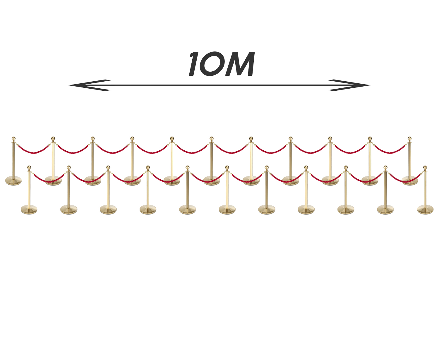 Ons 10 meter afzetpakket in goud met rood gevlochten koord is de perfecte keuze voor evenementen waar elegantie en organisatie samenkomen. Dit pakket bevat 22 verfijnde gouden afzetpalen en 20 prachtige rode gevlochten koorden om een onvergetelijke entree te creëren.