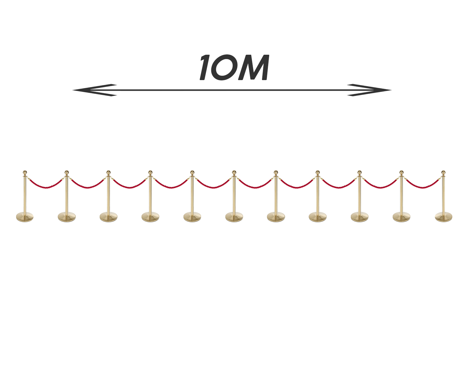 Ons 10 meter afzetpakket in goud met rood gevlochten koord is de perfecte keuze voor evenementen waar elegantie en organisatie samenkomen. Dit pakket bevat 11 verfijnde gouden afzetpalen en 10 prachtige rode gevlochten koorden om een onvergetelijke entree te creëren.