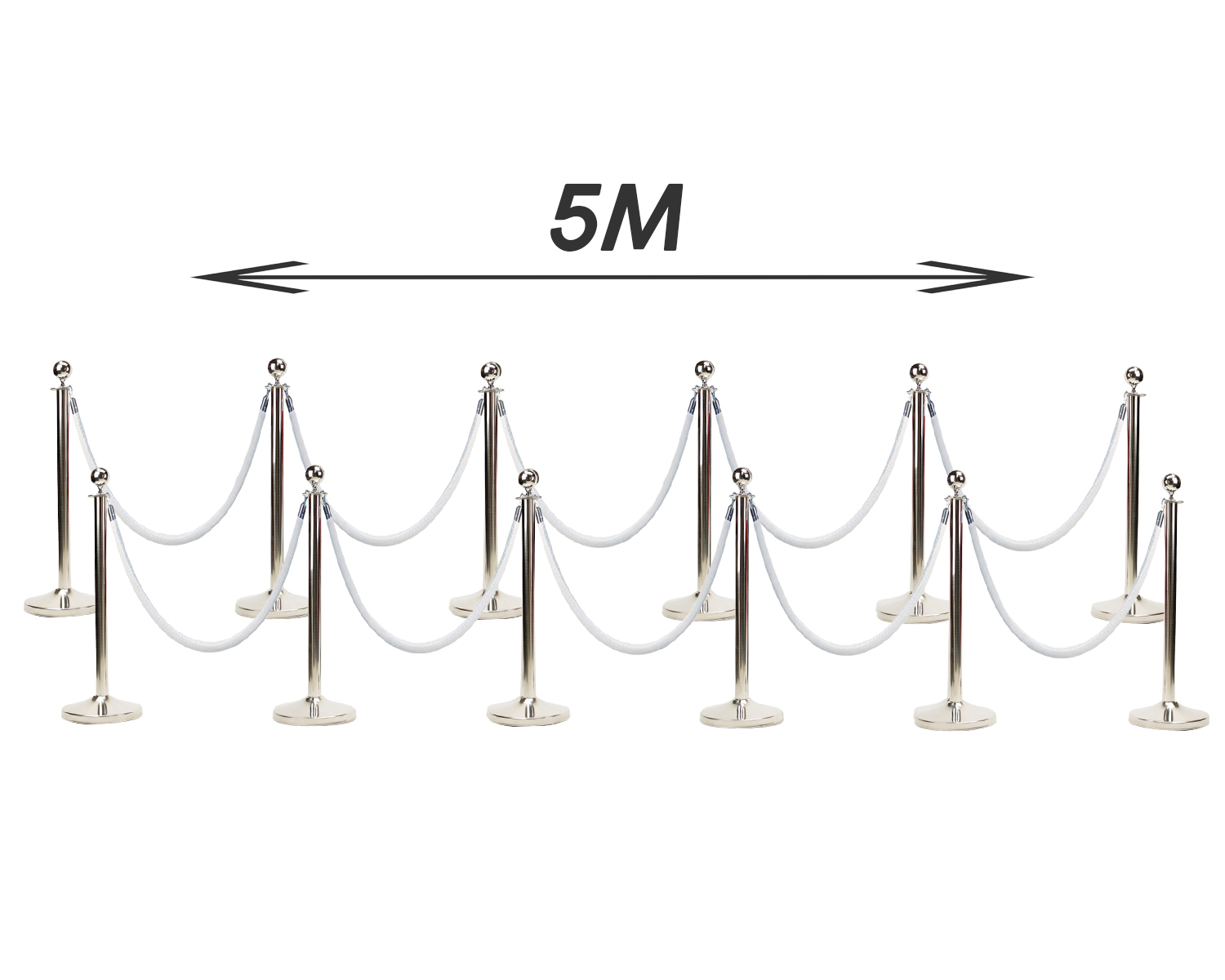 Ons 5 meter afzetpakket in chroom met wit fluwelen koord is de perfecte keuze voor evenementen waar elegantie en organisatie samenkomen. Dit pakket bevat 12 verfijnde afzetpalen en 10 prachtige witte fluwelen koorden om een onvergetelijke entree te creëren.