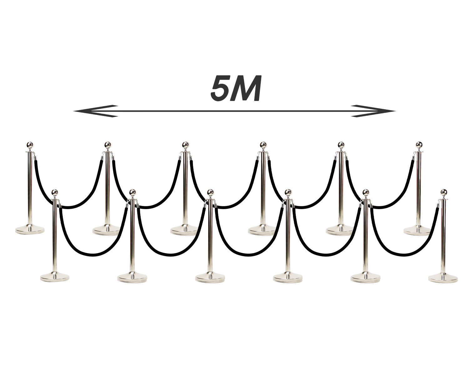 Ons 5 meter afzetpakket in chroom met zwart fluwelen koord is de perfecte keuze voor evenementen waar elegantie en organisatie samenkomen. Dit pakket bevat 12 verfijnde afzetpalen en 10 prachtige zwarte fluwelen koorden om een onvergetelijke entree te creëren.