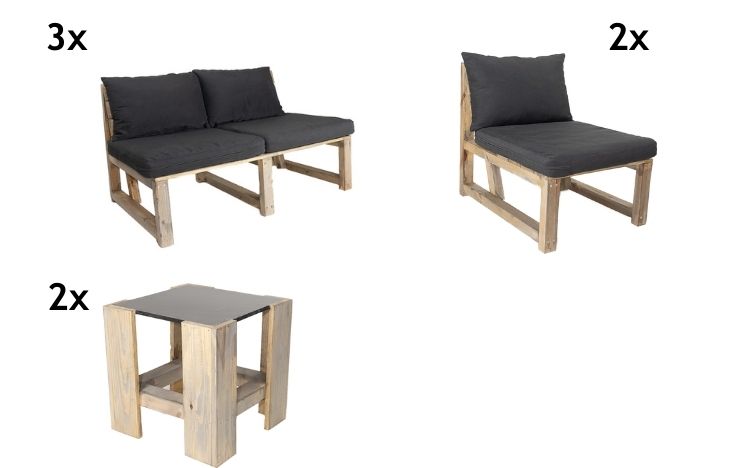 De steigerhouten set bestaat uit 3 dubbelzits, 2 enkelzits en 2 salontafels. Een ideale lounge opstelling voor je tuinfeest uiteraard.