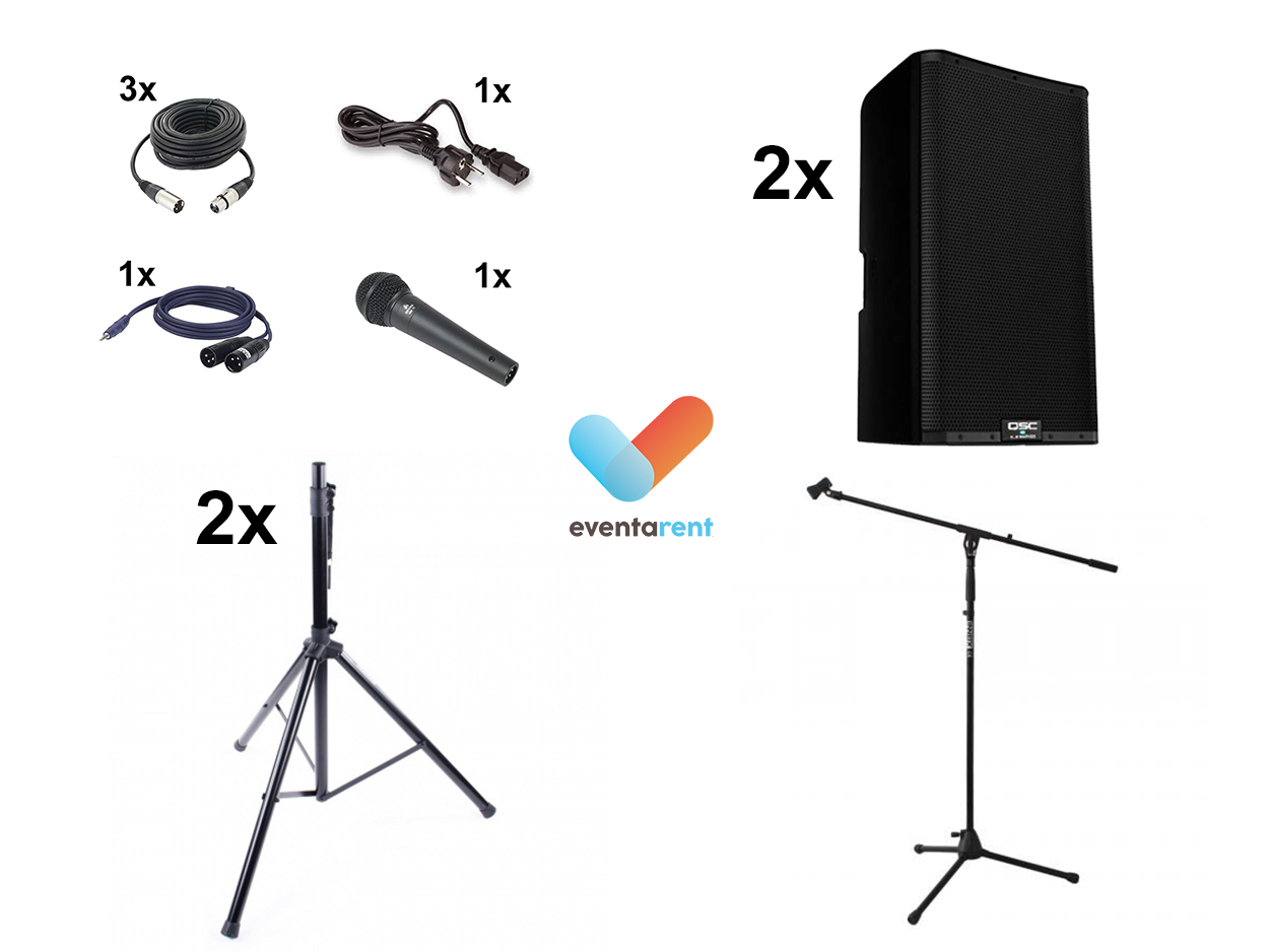 Dit pakket is het meest gehuurde licht- en geluidspakket voor ceremonies. Het bestaat uit een basis muziekinstallatie dewelke bestaat uit 2 professionele en zeer krachtige muziekboxen met statieven en de nodige bekabeling inclusief een micro op statief.