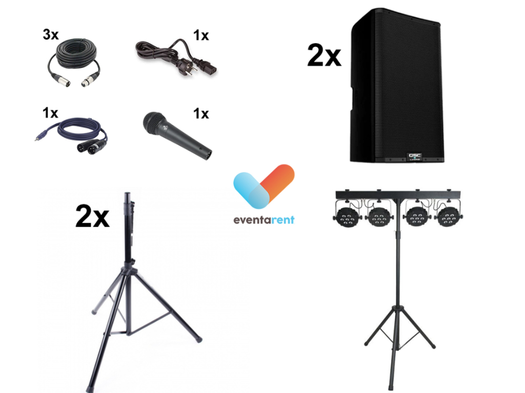 Dit pakket is het meest gehuurde licht- en geluidspakket voor dansfeesten. Het bestaat uit een basis muziekinstallatie dewelke bestaat uit 2 professionele en zeer krachtige muziekboxen op statieven alsook het meest populaire lichteffect.