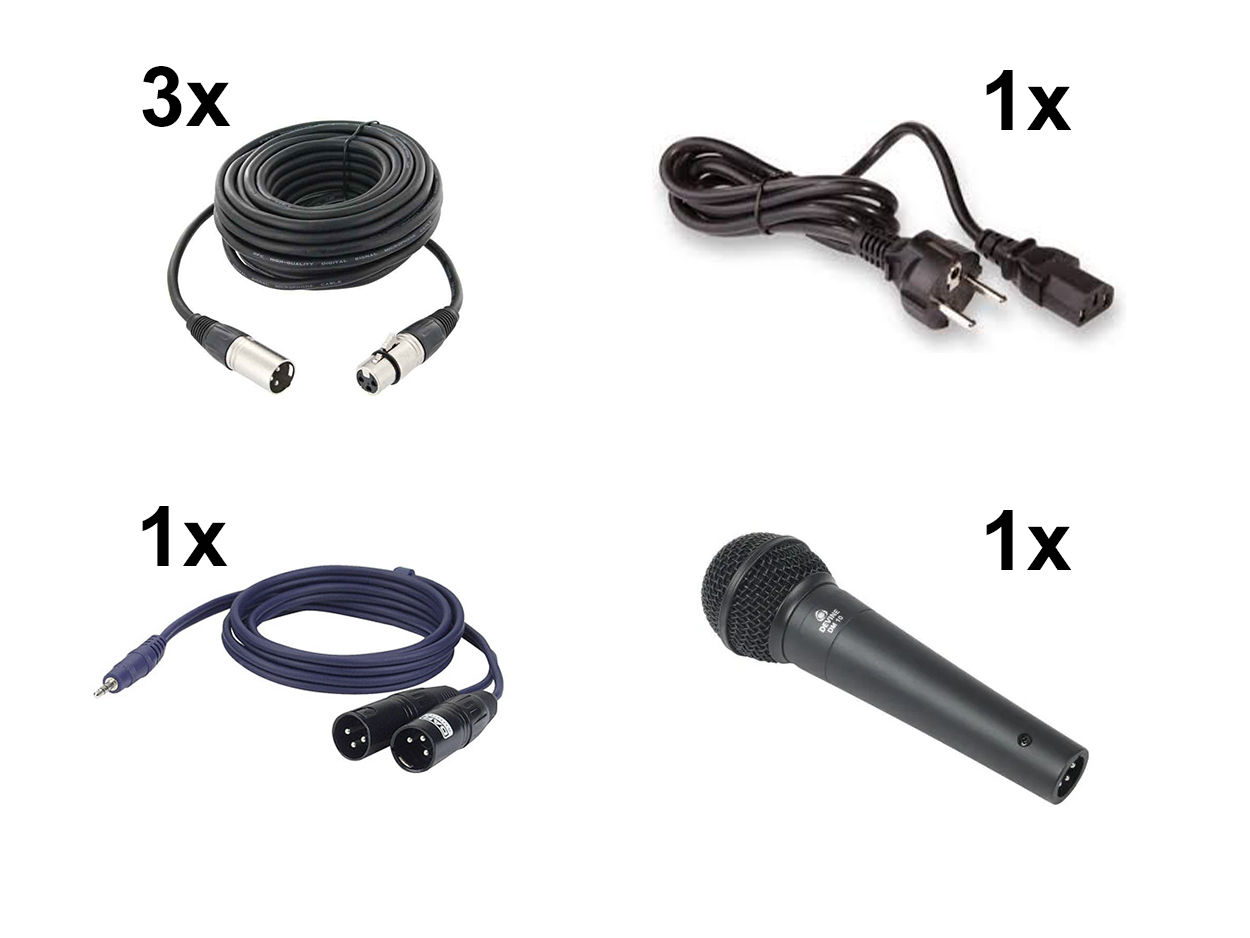 - Bekabelingskoffer met 3 xlr-kabels 20m, aansluiting tussen box en mini-jack (voor in smartphone of computer) en micro.
