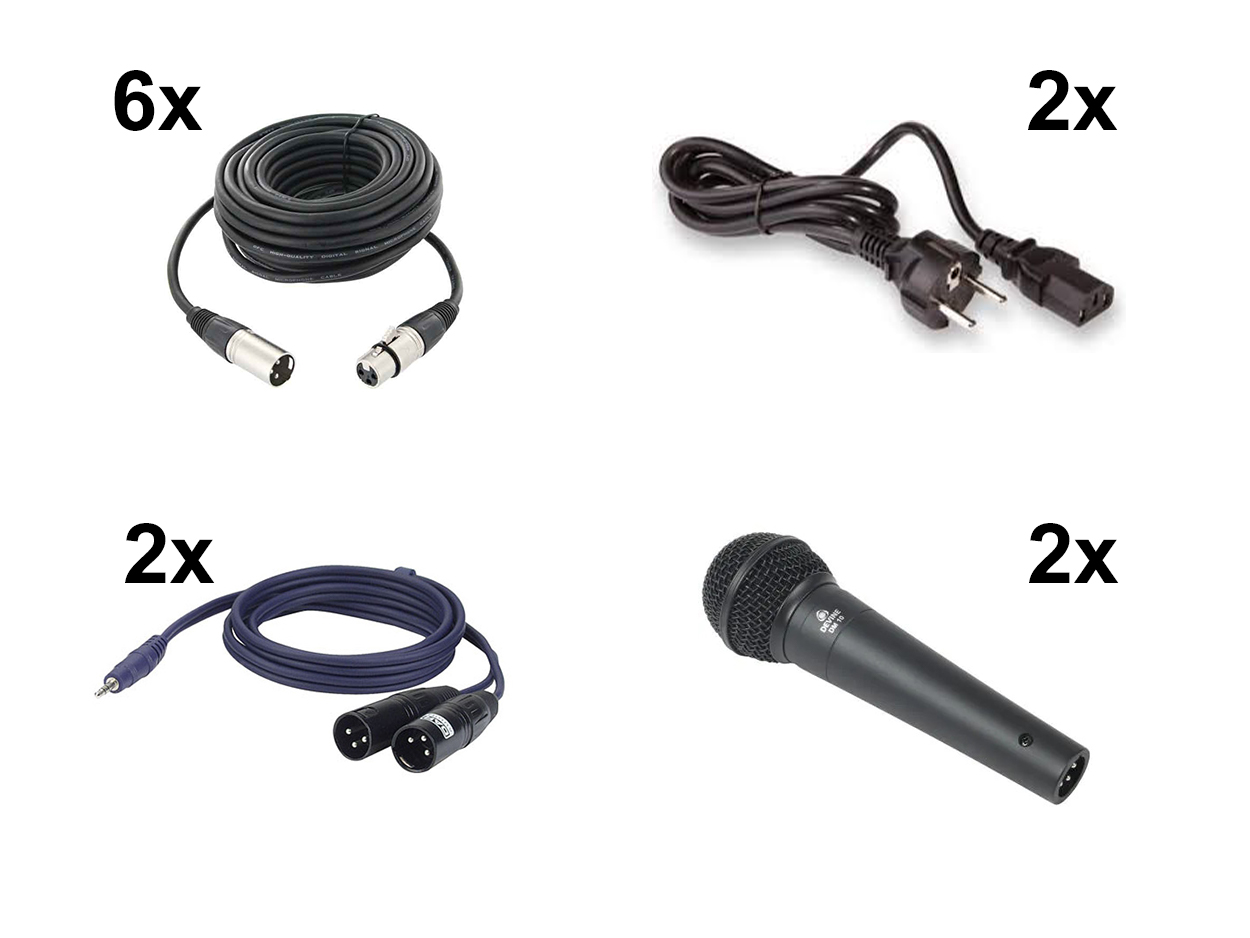 - 2 Bekabelingskoffers met 3 xlr-kabels 20m, aansluiting tussen box en mini-jack (voor in smartphone of computer) en micro.