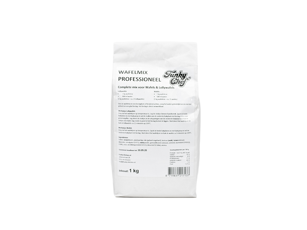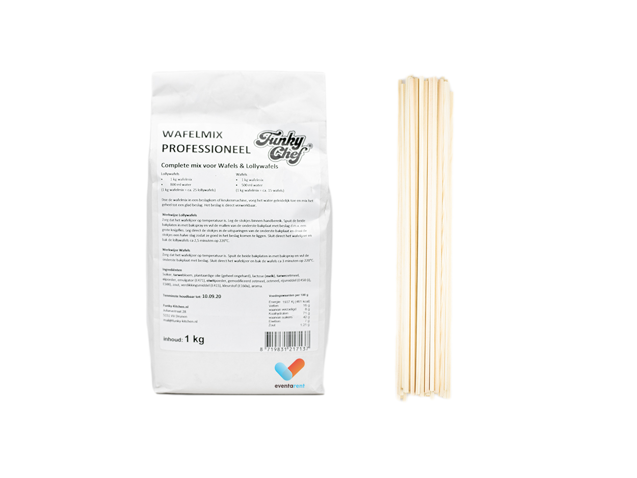 De wafellolly-mix heeft de authentieke wafelsmaak met een vleugje vanille! De kg deegmix worden geleverd met 25 wafeldeegstokjes van 38 cm lang.