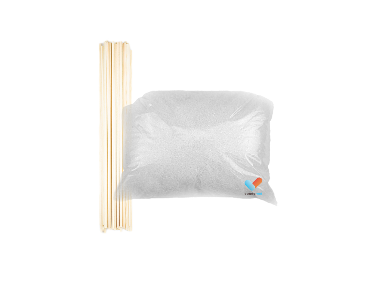 Onze suikerspin porties bestaan uit suikerspinsuiker voor 50 personen en 50 stokjes. Met de bij het toestel geleverde schep kan je voldoende suikerspin toevoegen om een mooie grote suikerspin te maken. Je kan hier ook extra roze porties of extra blauwe porties huren.