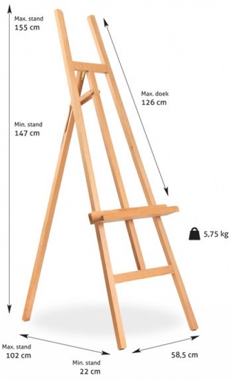 Deze schildersezel bestaat uit geolied beukenhout en is zowel in hoogte als in hoek verstelbaar. Je kan de driepoot ezel op die manier helemaal naar wens opstellen. De doekdrager kan omhoog en omlaag geschoven worden en zo kleinere en grotere doeken dragen.