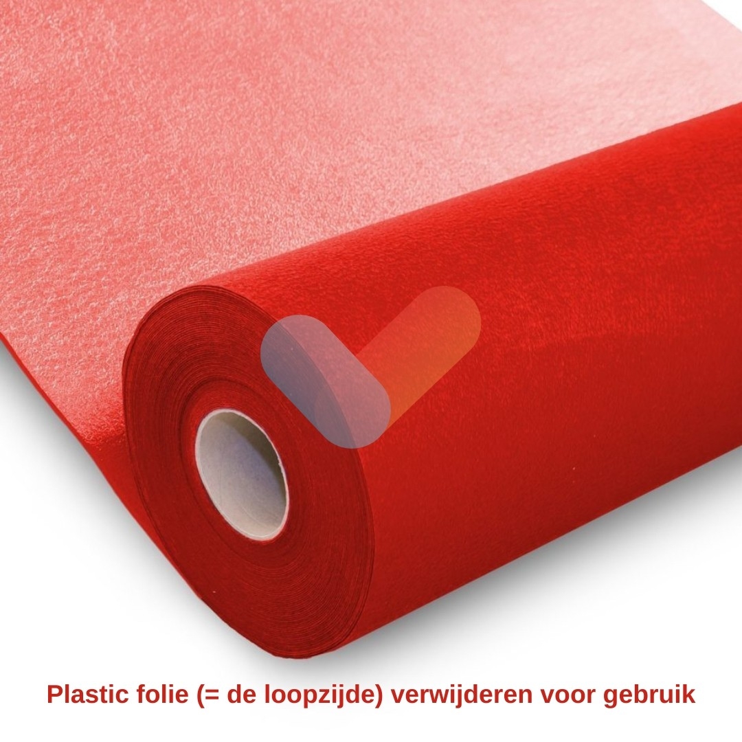 - Rol de loper uit met de beschermingsfolie naar boven. Dit is de bovenkant. Deze verwijder je voorzichtig net voor start van je event. Deze zorgt ervoor dat de loper tijdens montage proper blijft.