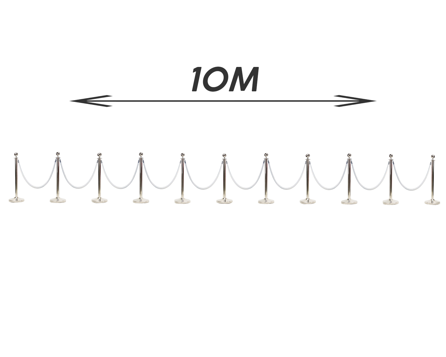 Ons 10 meter afzetpakket in chroom met wit fluwelen koord is de perfecte keuze voor evenementen waar elegantie en organisatie samenkomen. Dit pakket bevat 11 verfijnde afzetpalen en 10 prachtige witte fluwelen koorden om een onvergetelijke entree te creëren.