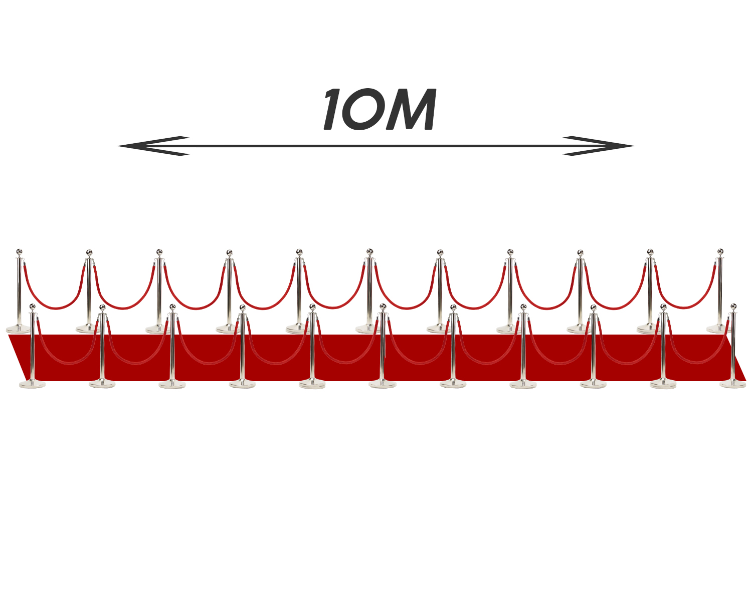 Ons 10 meter afzetpakket in chroom met rood fluwelen koord is de perfecte keuze voor evenementen waar elegantie en organisatie samenkomen. Dit pakket bevat 22 verfijnde afzetpalen en 20 prachtige rood fluwelen koorden, plus een 10 meter lange rode loper om een onvergetelijke entree te creëren.