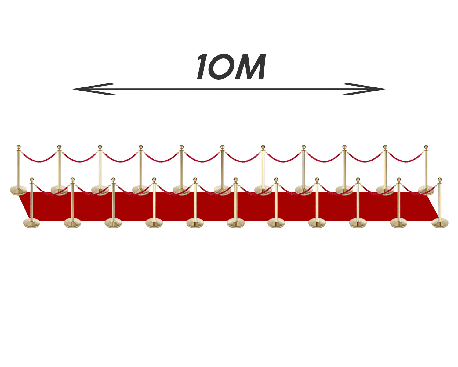 Ons 10 meter afzetpakket in goud met rood gevlochten koord is de perfecte keuze voor evenementen waar elegantie en organisatie samenkomen. Dit pakket bevat 22 verfijnde gouden afzetpalen en 20 prachtige rode gevlochten koorden, plus een 10 meter lange rode loper om een onvergetelijke entree te creëren.