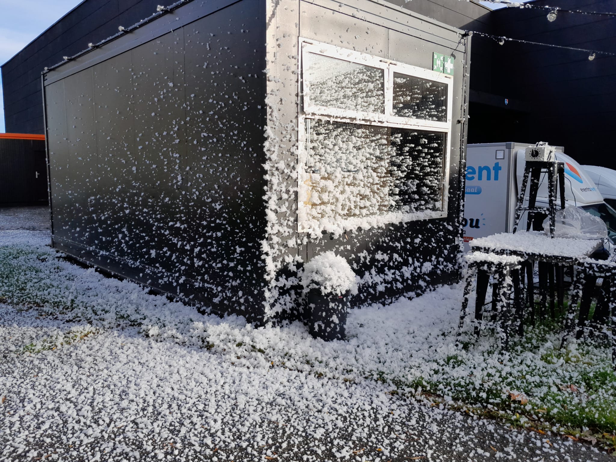 Laten we starten met het gegeven dat onze sneeuwmachines helaas geen echte sneeuw produceren. Sneeuwmachines die gebruikt worden als special effect produceren een soort schuim dat heel erg lijkt op sneeuw. Dit schuim wordt geproduceerd met een speciale sneeuwvloeistof. Deze vloeistof wordt door een ventilator onder hoge druk door een nylonkous geblazen. Op deze manier ontstaat het schuim en wordt het verdeeld zodat er geen grote bult schuim uit de machine komt, maar evenredig verdeelde ‘sneeuwvlokken’.