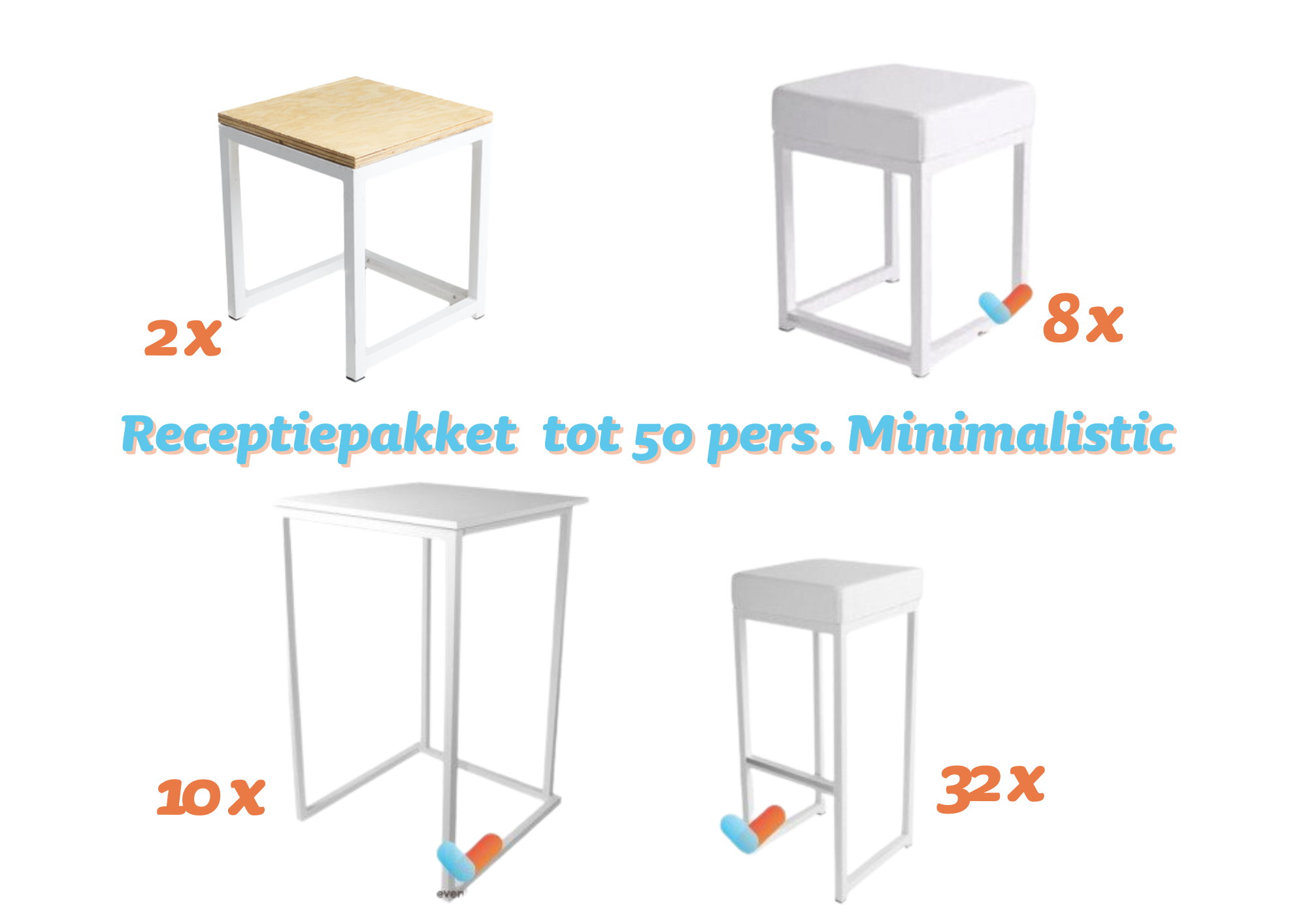 Creëer een elegante en stijlvolle sfeer voor uw (huwelijks)receptie met ons minimalistische verhuurpakket.
