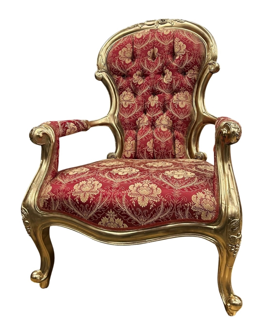 Kleur: fluweel rode stof met goude accenten en gouden armleuningen.