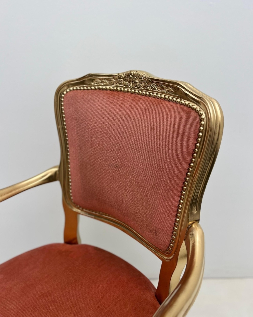 Kleur: fluweel rode stof op een gouden stoel