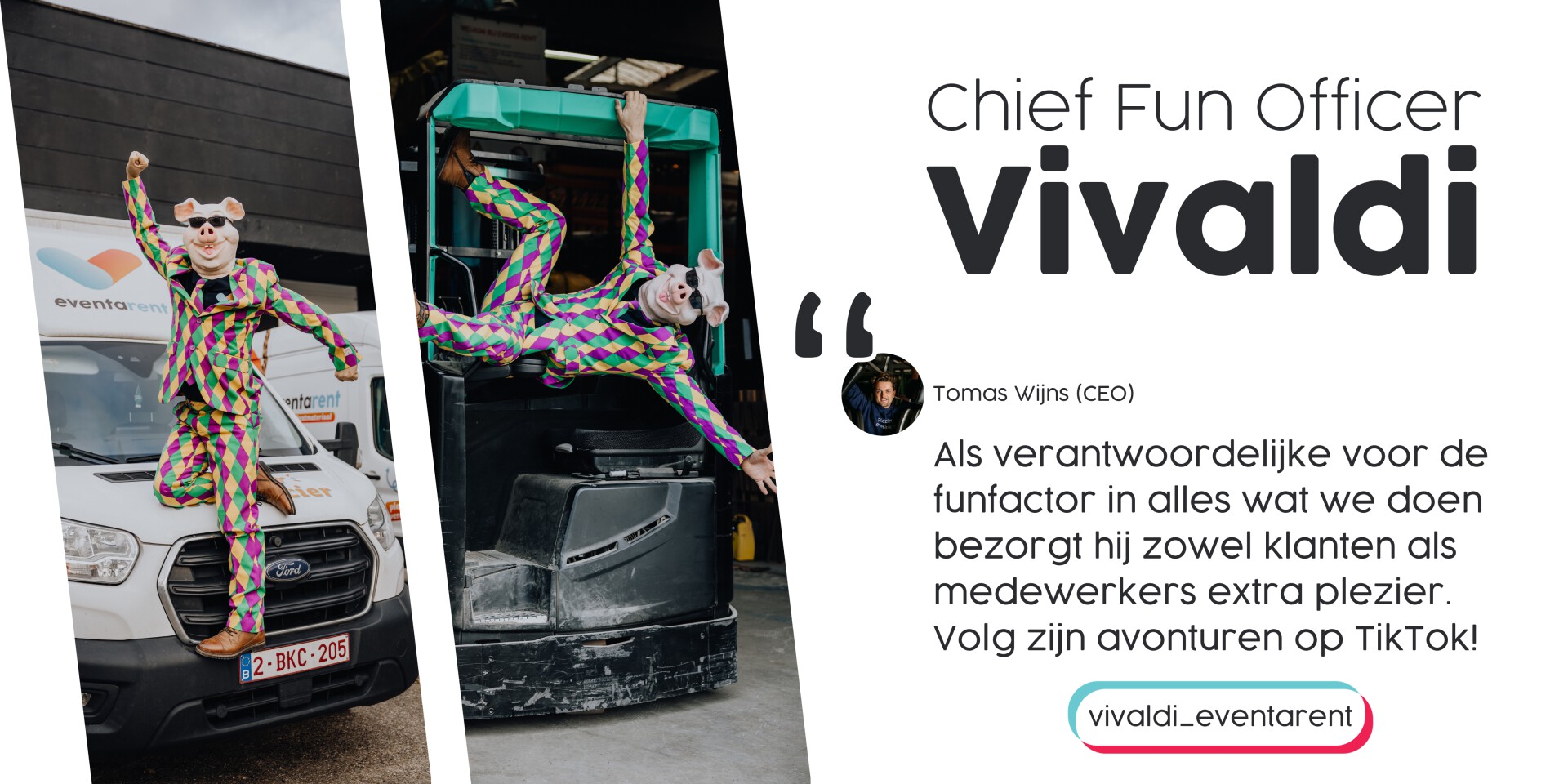 Tomas, die zag dat Vivaldi het magazijn en de materialen beter kende dan wie dan ook, had een idee. Hij dacht: "Misschien is dit precies wat Eventa Rent nodig heeft, iemand die plezier en vreugde kan brengen." En zo werd Vivaldi, het feestvarken, aangenomen als de Chief Fun Officer (CFO) van Eventa Rent.
