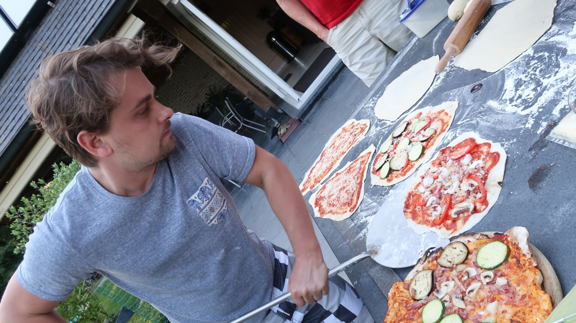- Leg op de grote pizzaschep een beetje bloem en schuif dan je pizza er op. Vervolgens controleer je dat de pizza los ligt op je schep, pas dan leg je deze in de oven zodat deze er eenvoudig kan afschuiven.